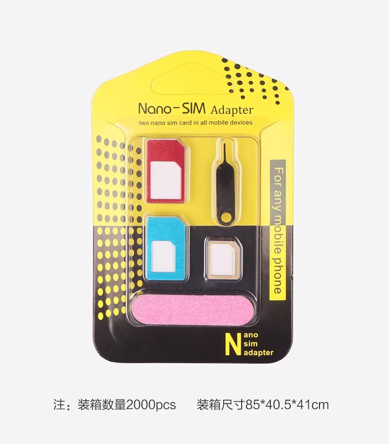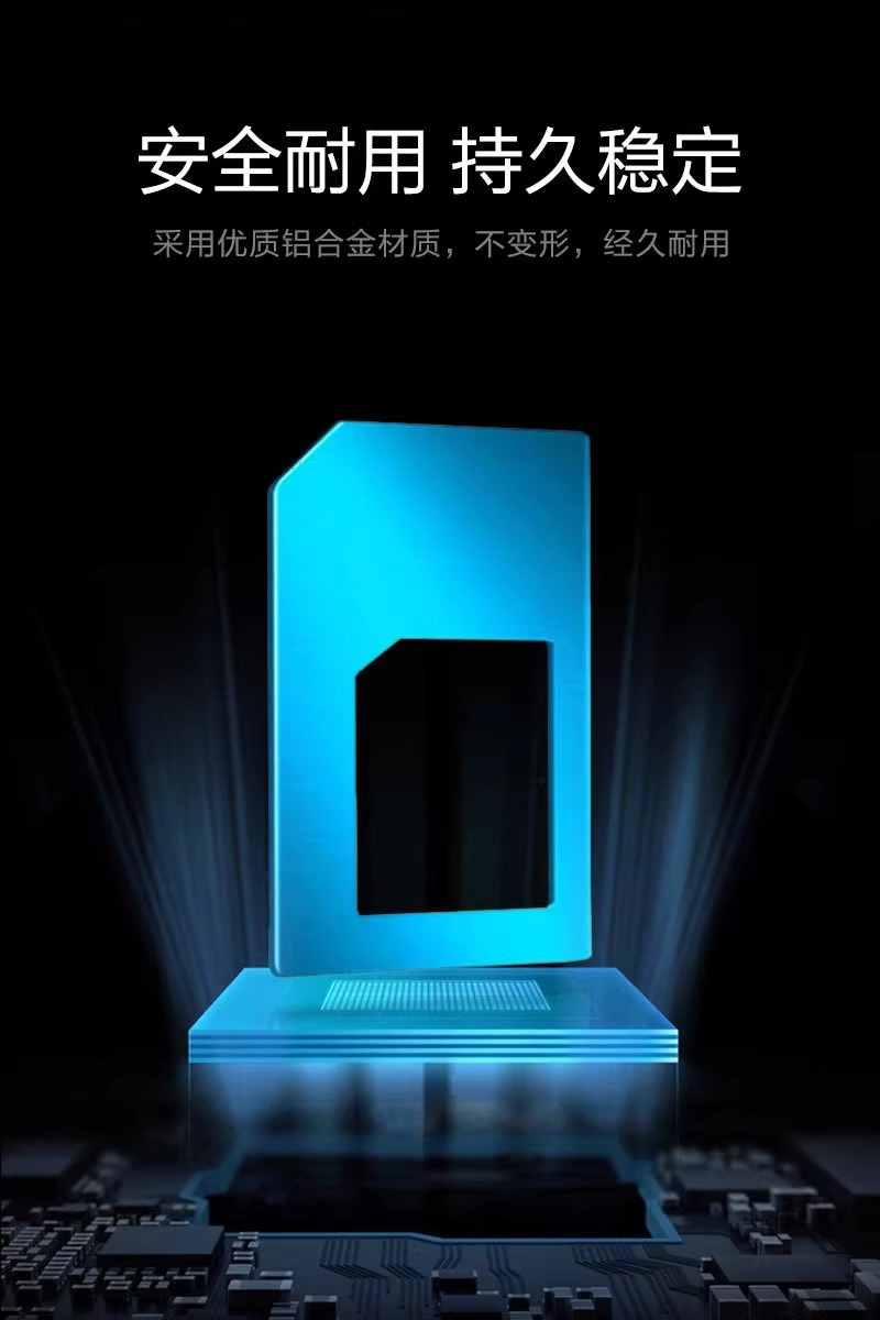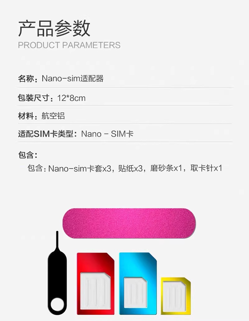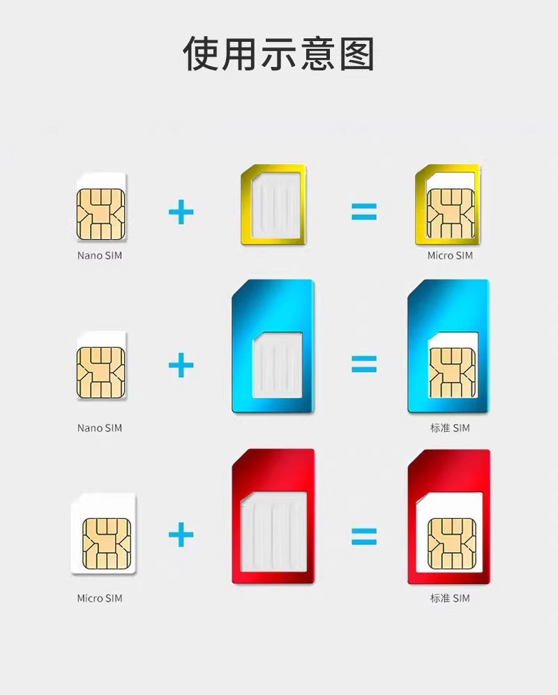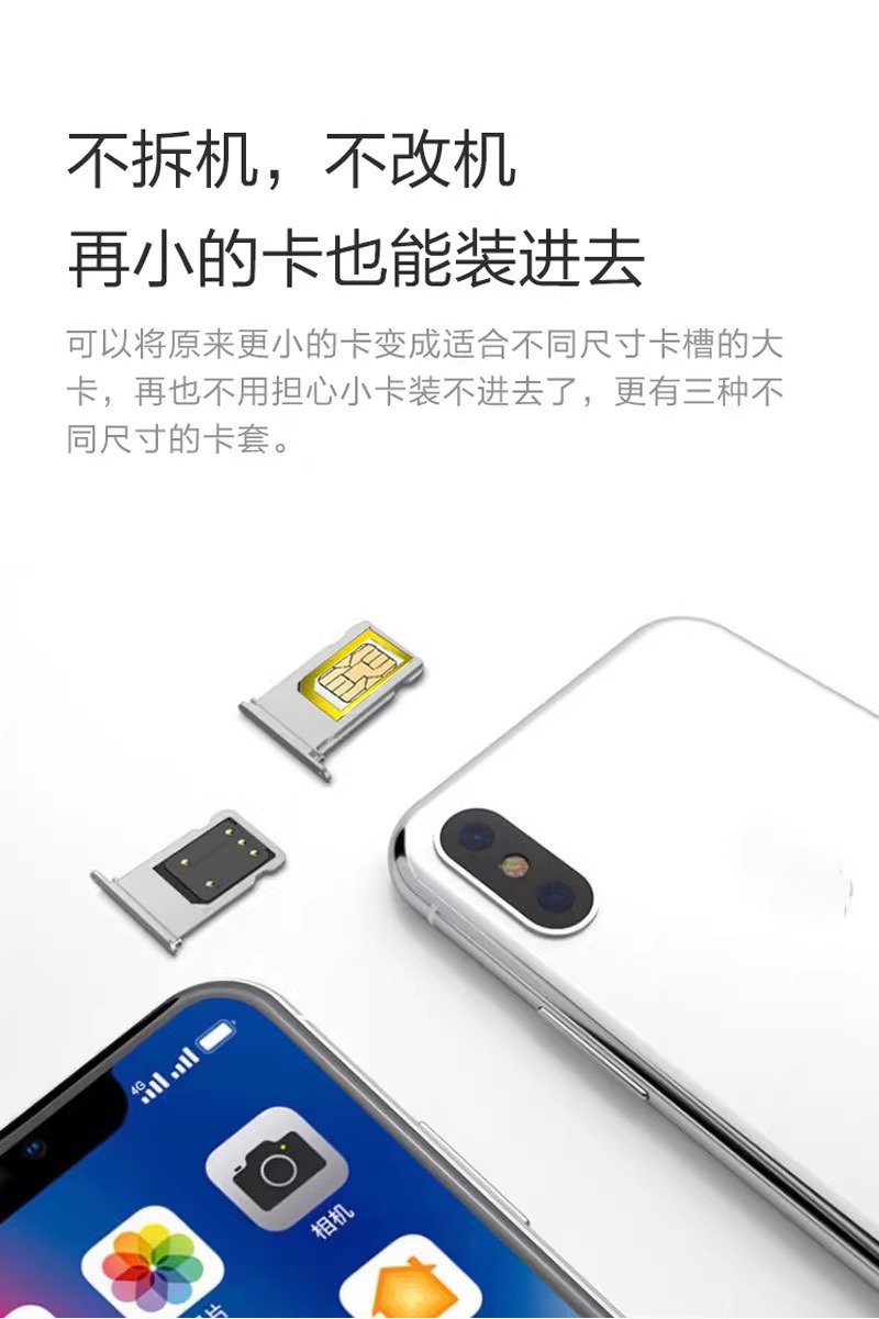 产品使用:转换SIM卡形状大小,一套分别有三种不同形状的卡套,可随意转换。