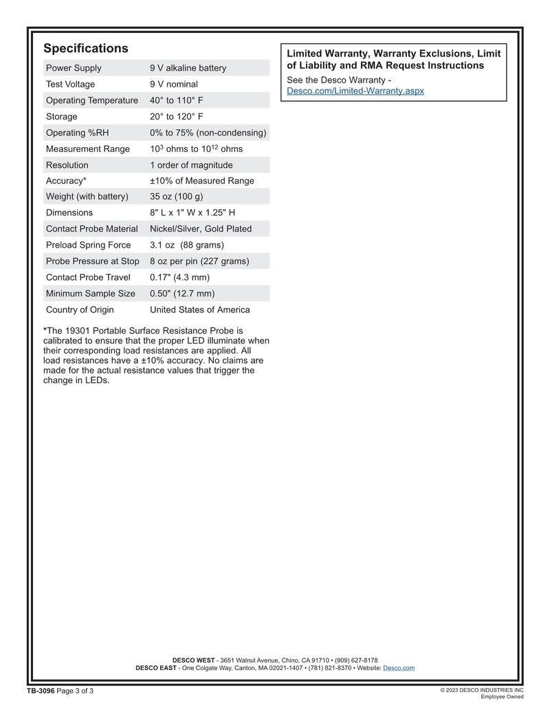 Ручной тестер поверхностного сопротивления American Desco 19301, антистатическая двухточечная тестовая ручка