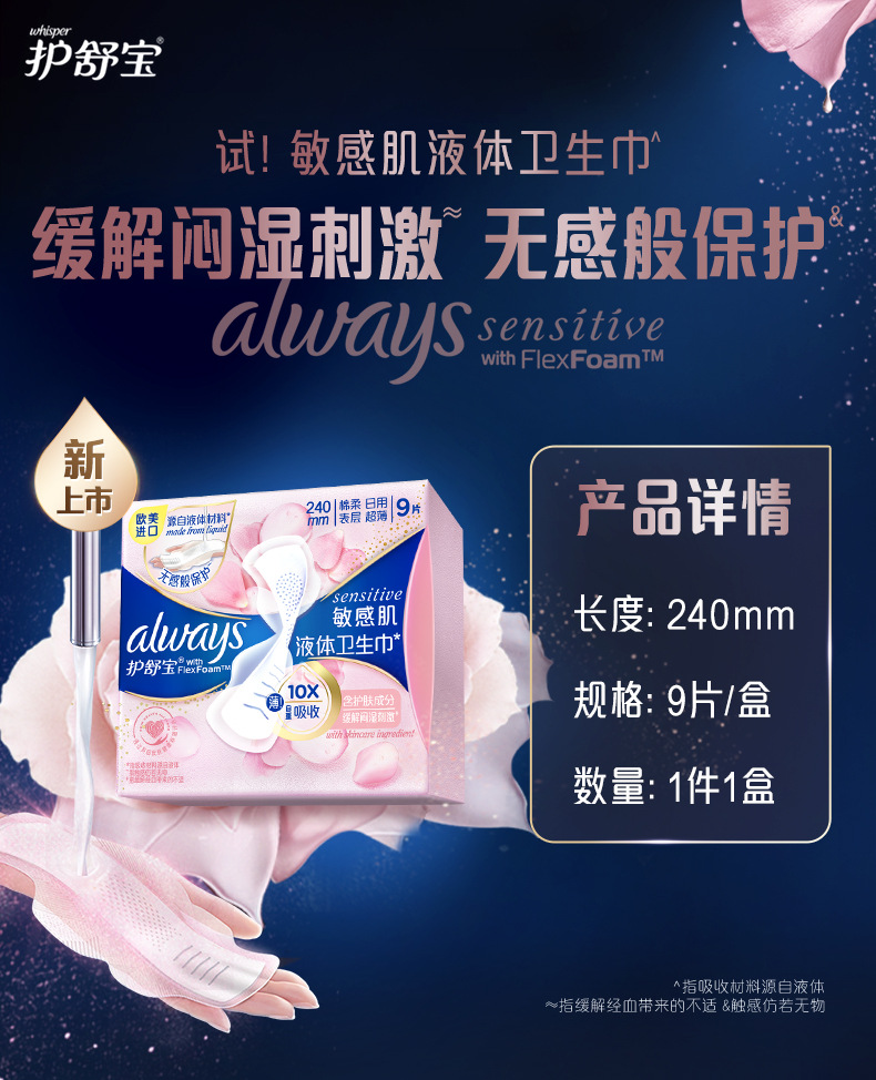 ![]() | Liquid sanitary napkin for sensitive skin 240mm 9 pieces/box (barcode: 1435, 12 boxes/box) | ¥20.61 / ≈ 251 ₽ | 78 | 5890083979285 | |