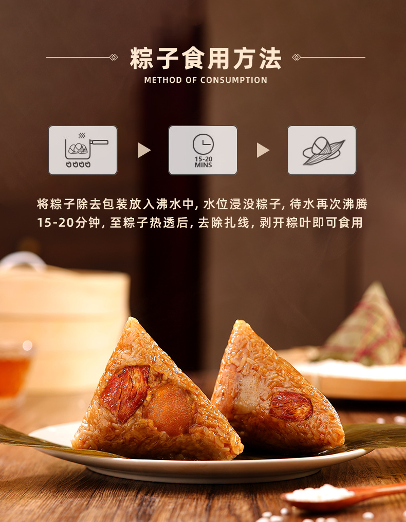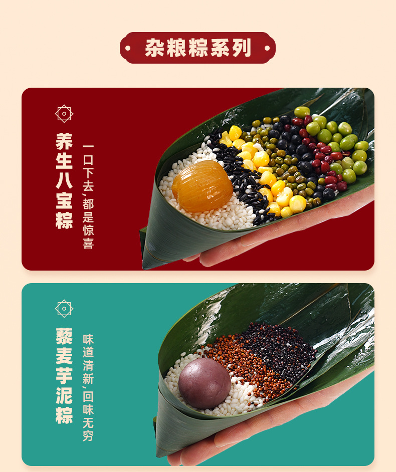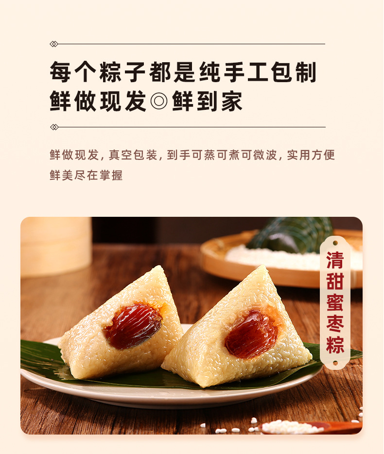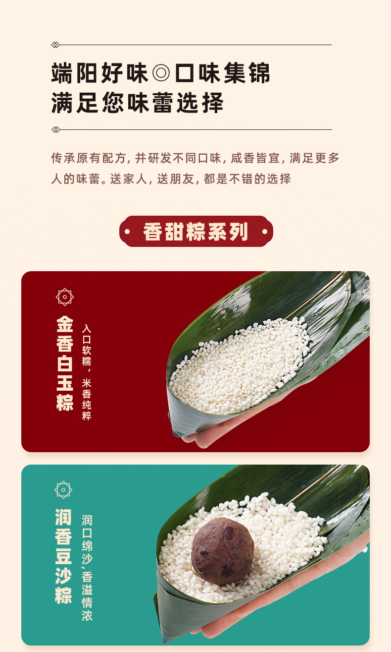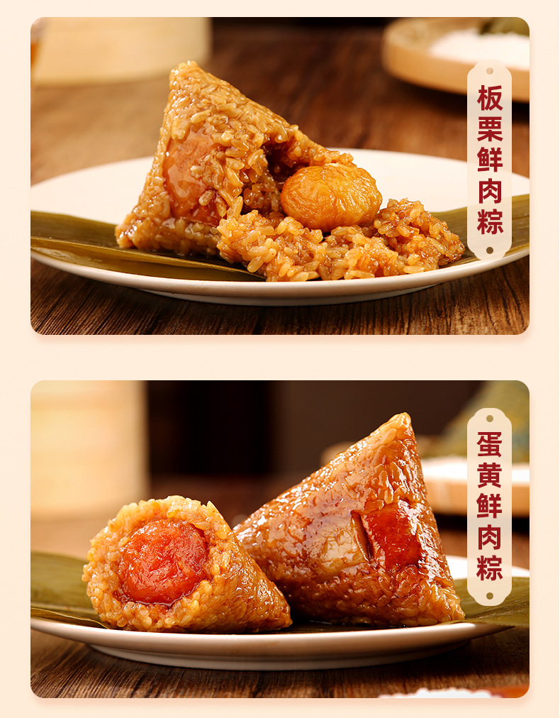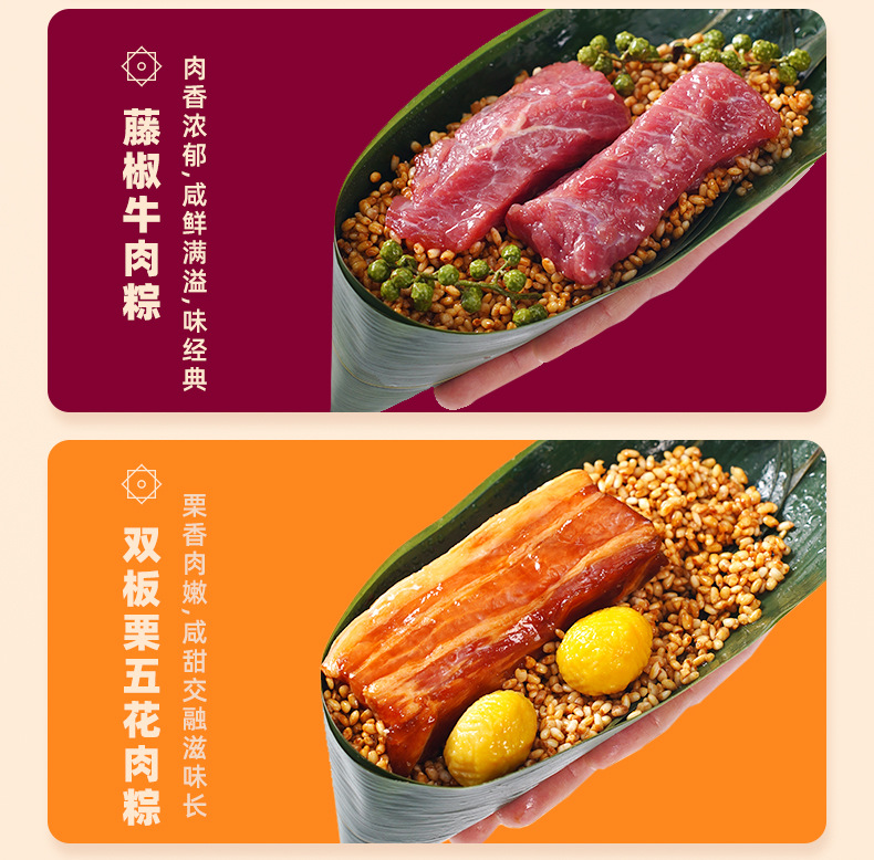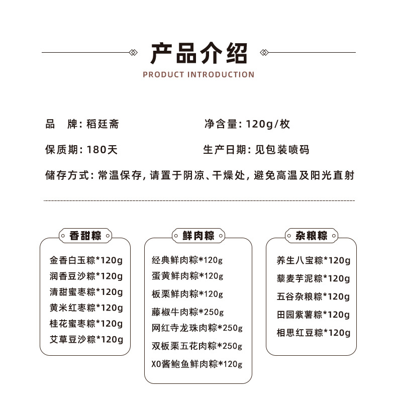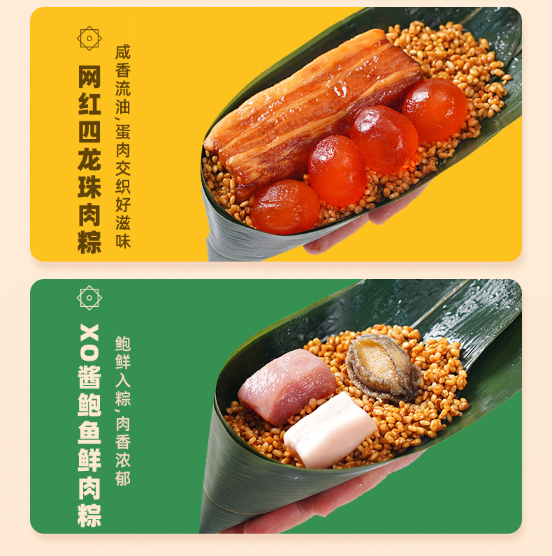 Название продукта Classic fresh meat rice dumplings, egg yolk fresh meat rice dumplings, chestnut fresh meat rice dumplings, vine pepper beef rice dumplings, internet celebrity four dragon pearl meat rice dumplings, double chestnut pork belly rice dumplings, xo sauce abalone fresh meat rice dumplings