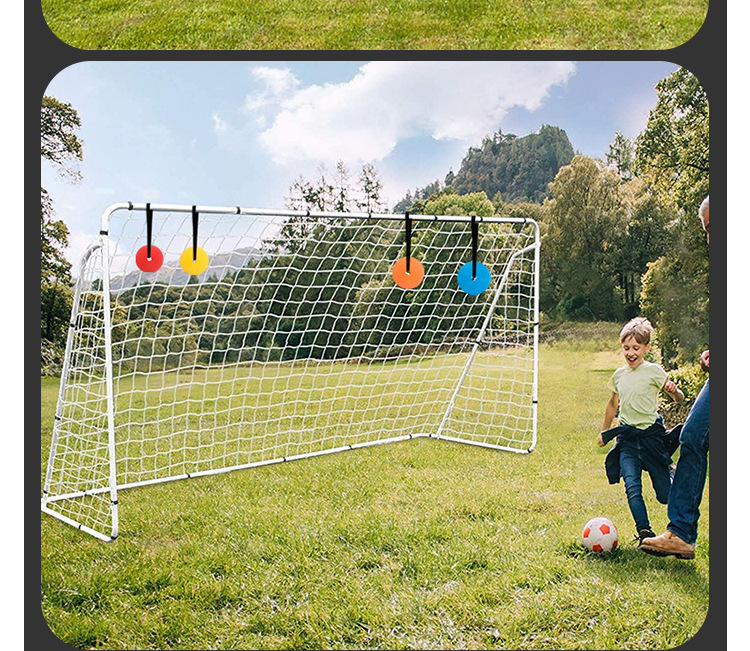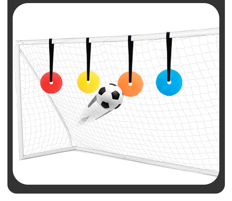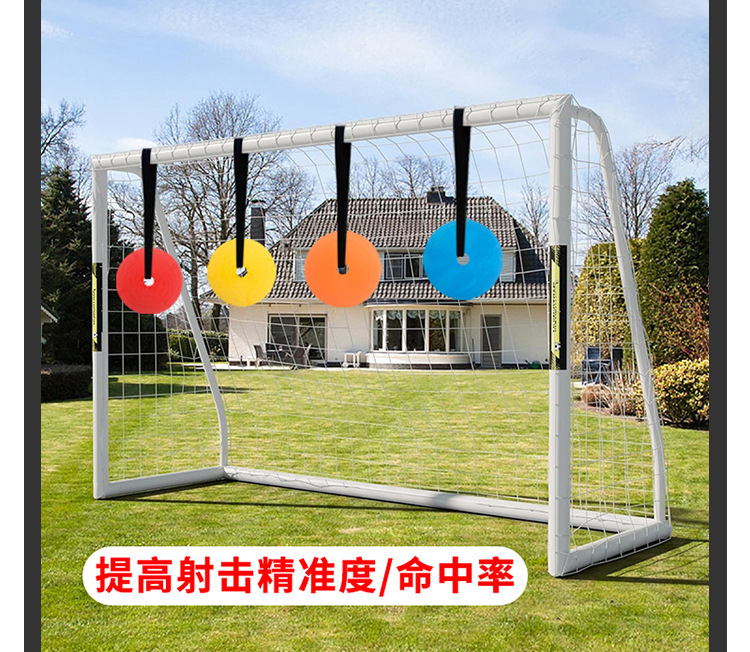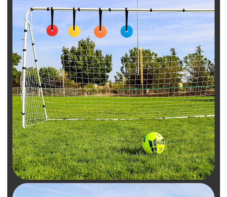 "足球目标靶" 足球训练中的目标靶,用于提高射门精准度。放置在球门角落或特定位置,帮助球员练习精准射门。可调整位置,模拟不同比赛场景,提升射门技巧。悬挂在空中,用于练习头球或高球射门。适用于个人或团队训练,能有效提升射门精准度和技术。