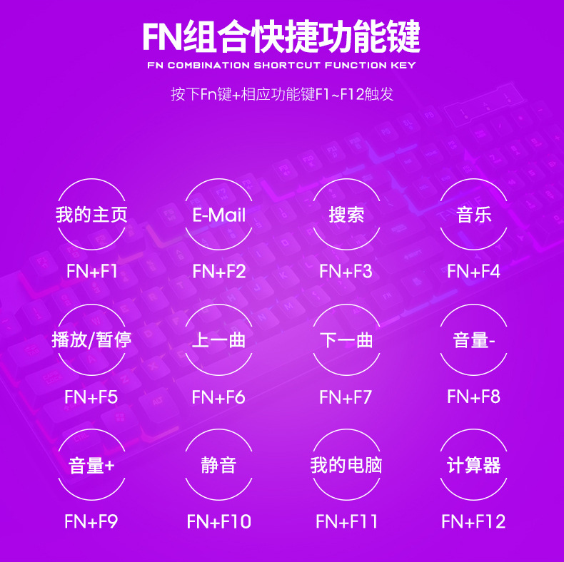 鼠标尺寸 128*73*42mm 键盘尺寸 440*130*30mm 裸机重量 键盘432g 鼠标72g 包装尺寸 530*145*42mm 带包重量 650g 装箱数量 30pcs 装箱尺寸 650*545*315mm 箱规立方 0.1116 装箱重量 20.5kg