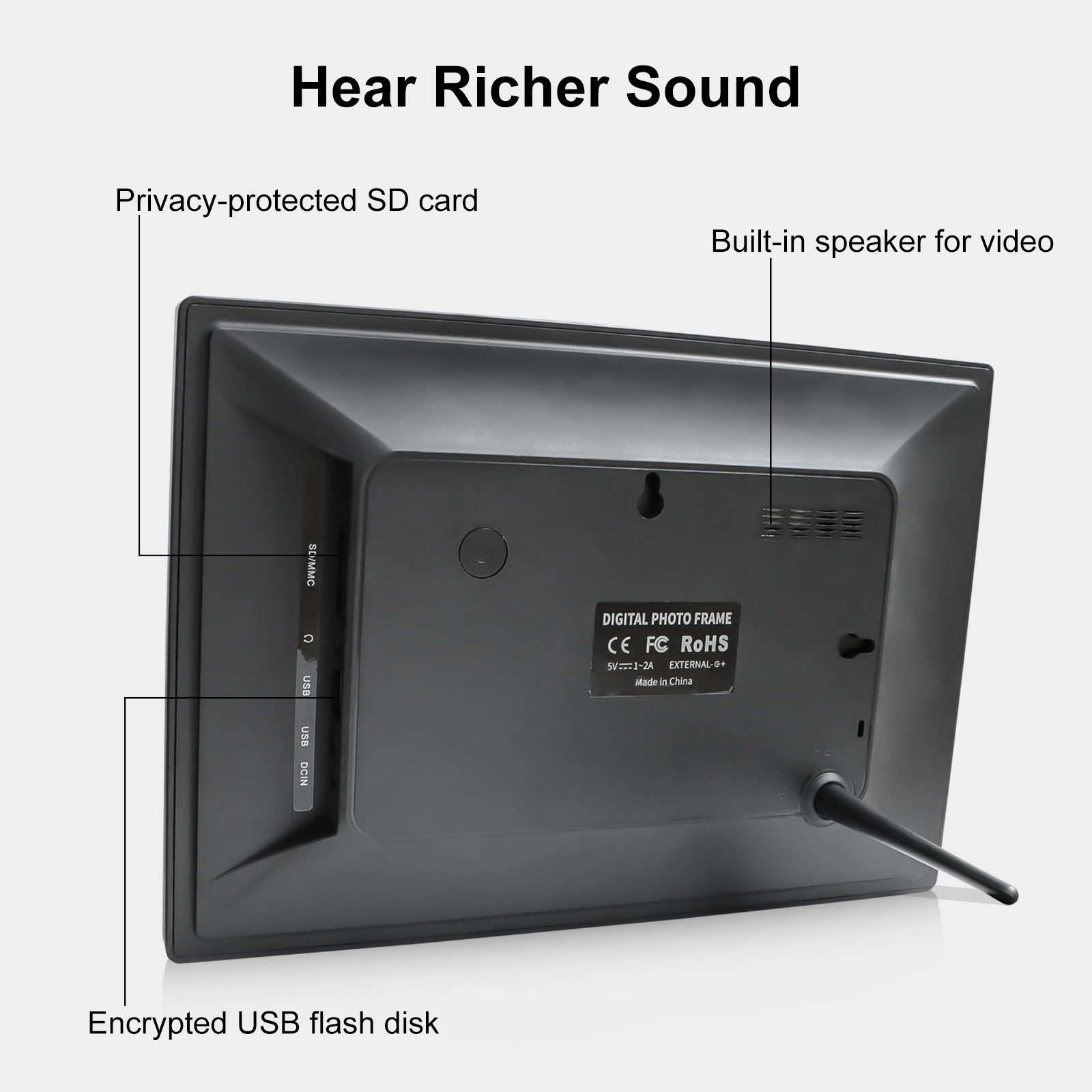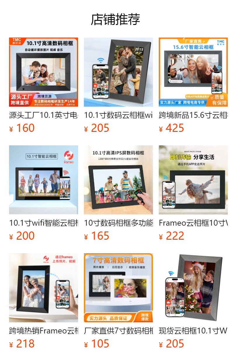 功能特性:带WIFI,支持手机App远程发送照片/视频到相框上,全屏触摸,带重力感应支持横竖摆放,可导入导出照片,有天气预报和时间显示,中英文等多国语言