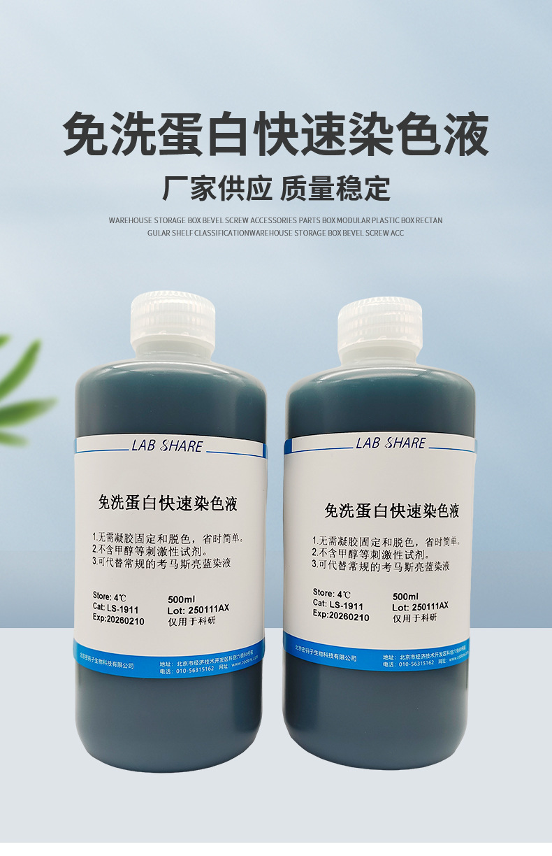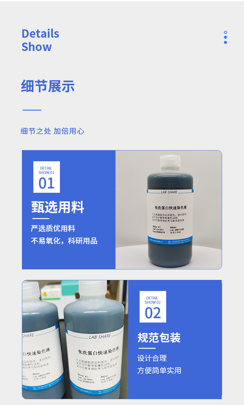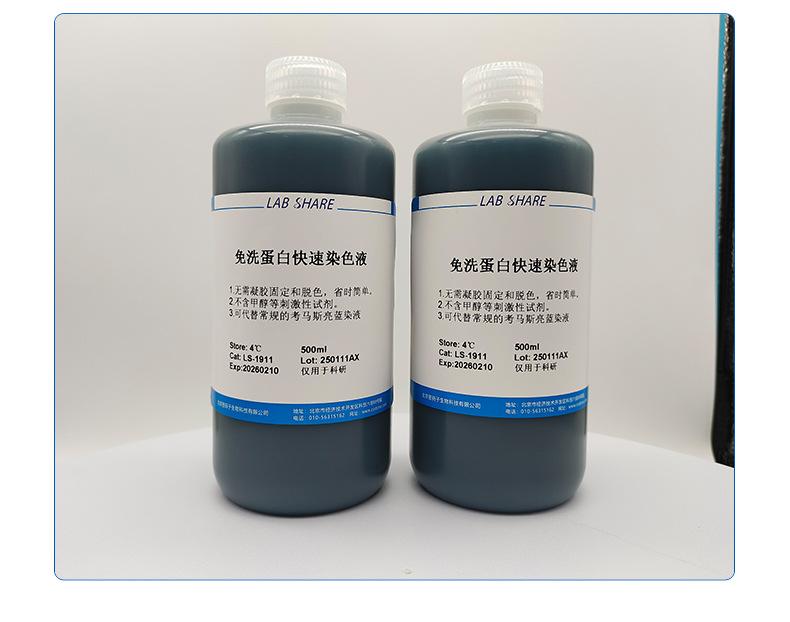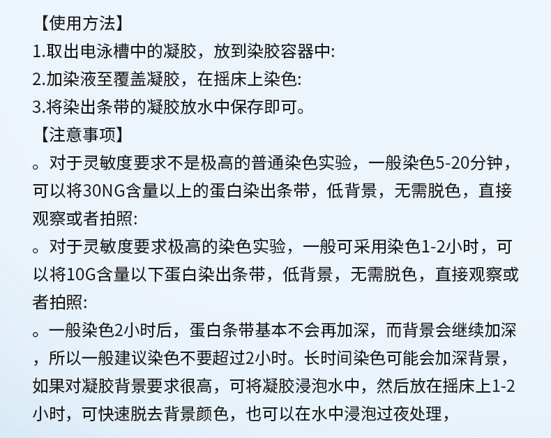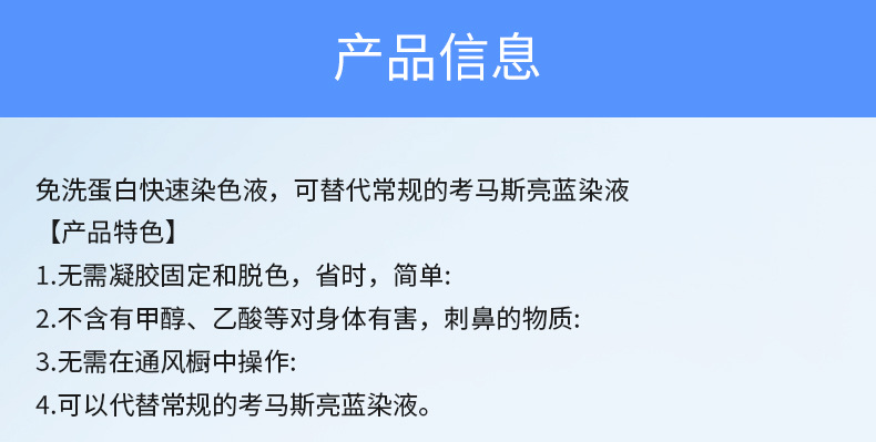 Область применения The no-wash protein quick staining solution is a green environmental-friendly type protein glue dye that can replace conventional osmanthus bright blue dye.