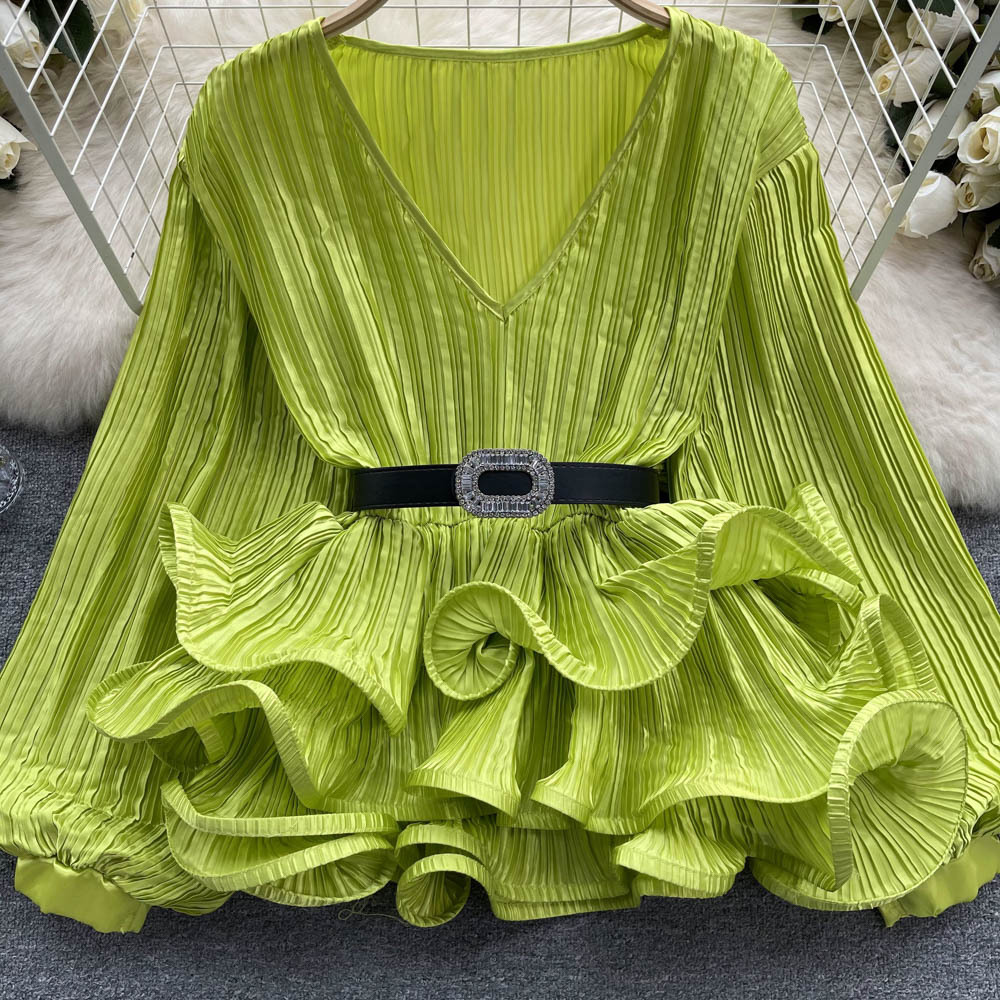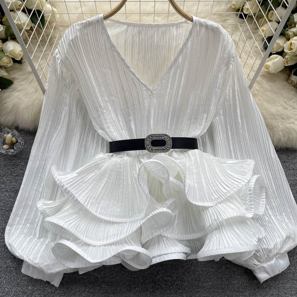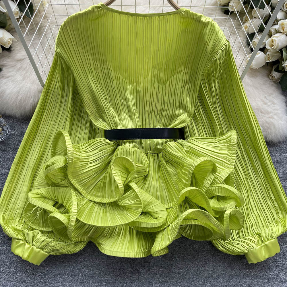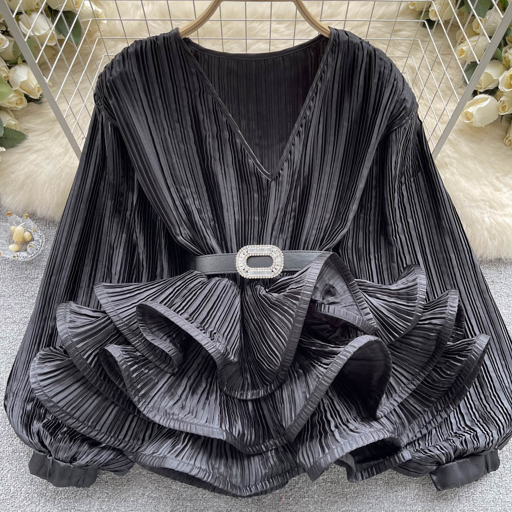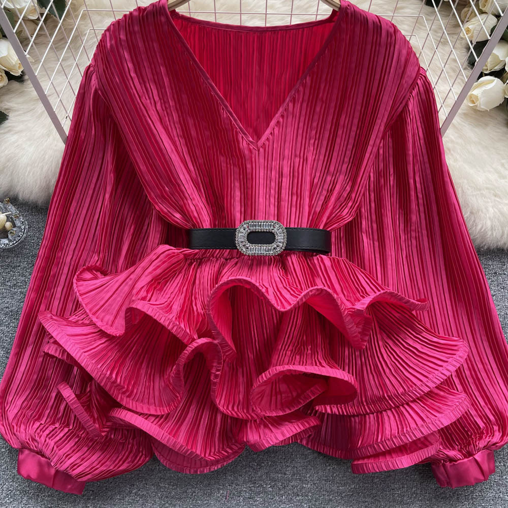 Элегантный свободный топ из сатина с длинным рукавом, рюши, фонарные рукава, нишевый дизайн, рубашка с V-образным вырезом