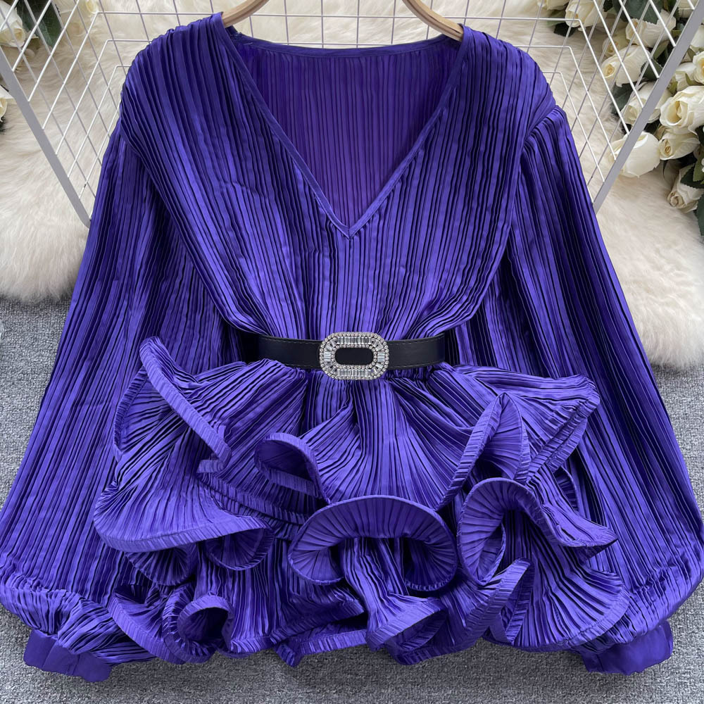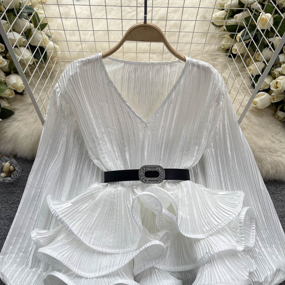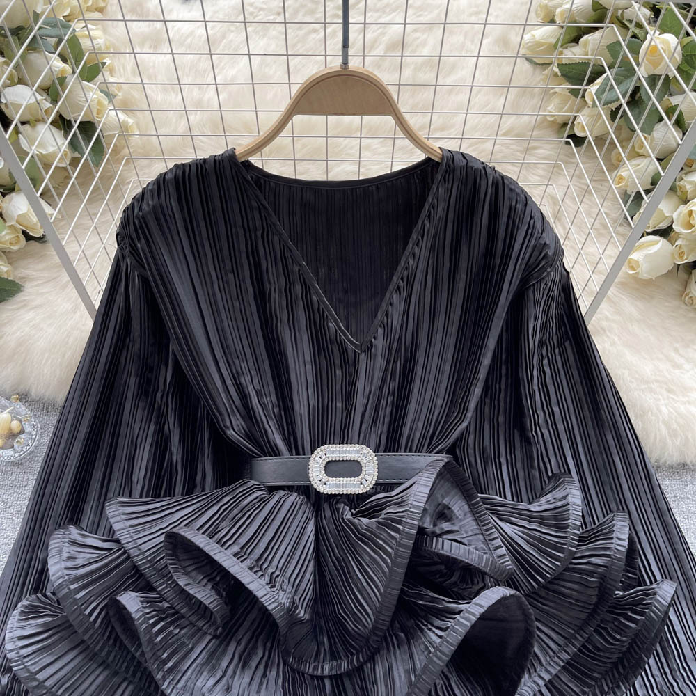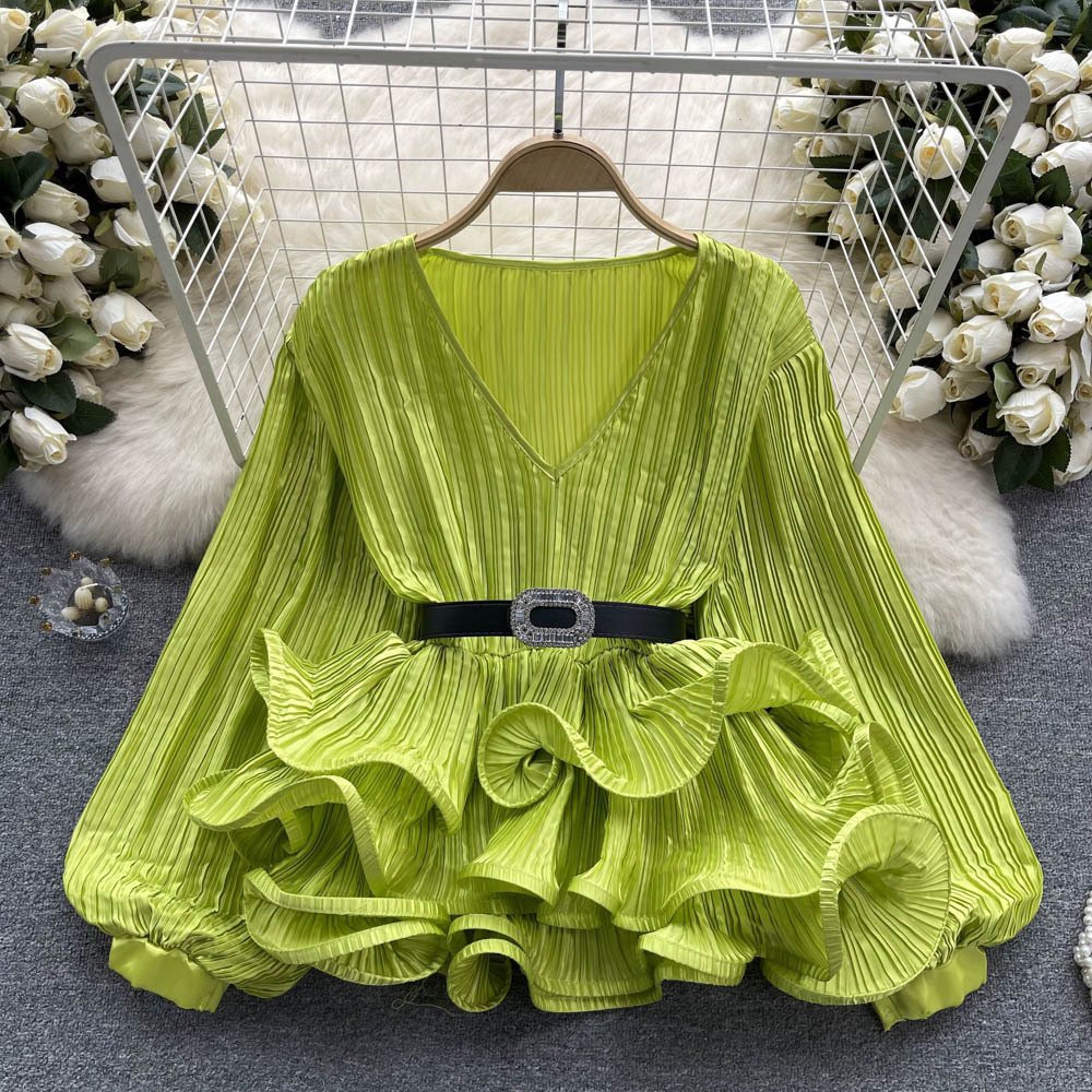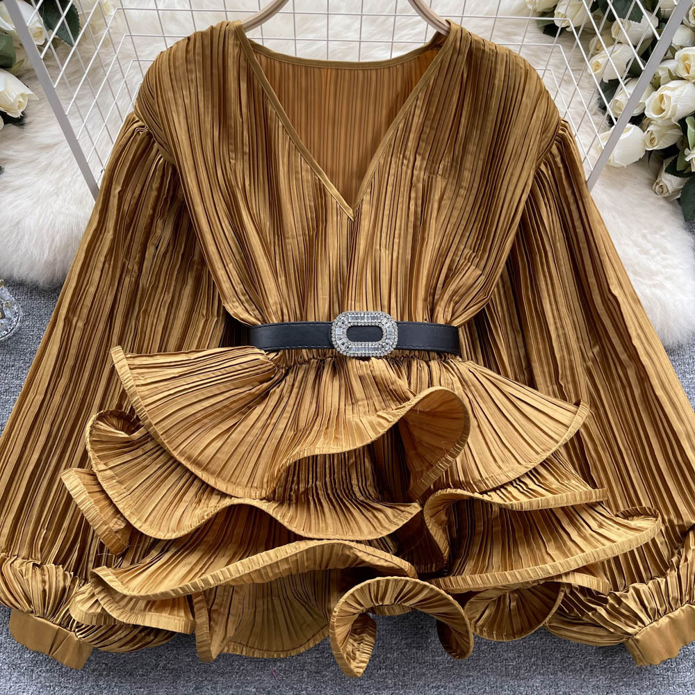Элегантный свободный топ из сатина с длинным рукавом, рюши, фонарные рукава, нишевый дизайн, рубашка с V-образным вырезом