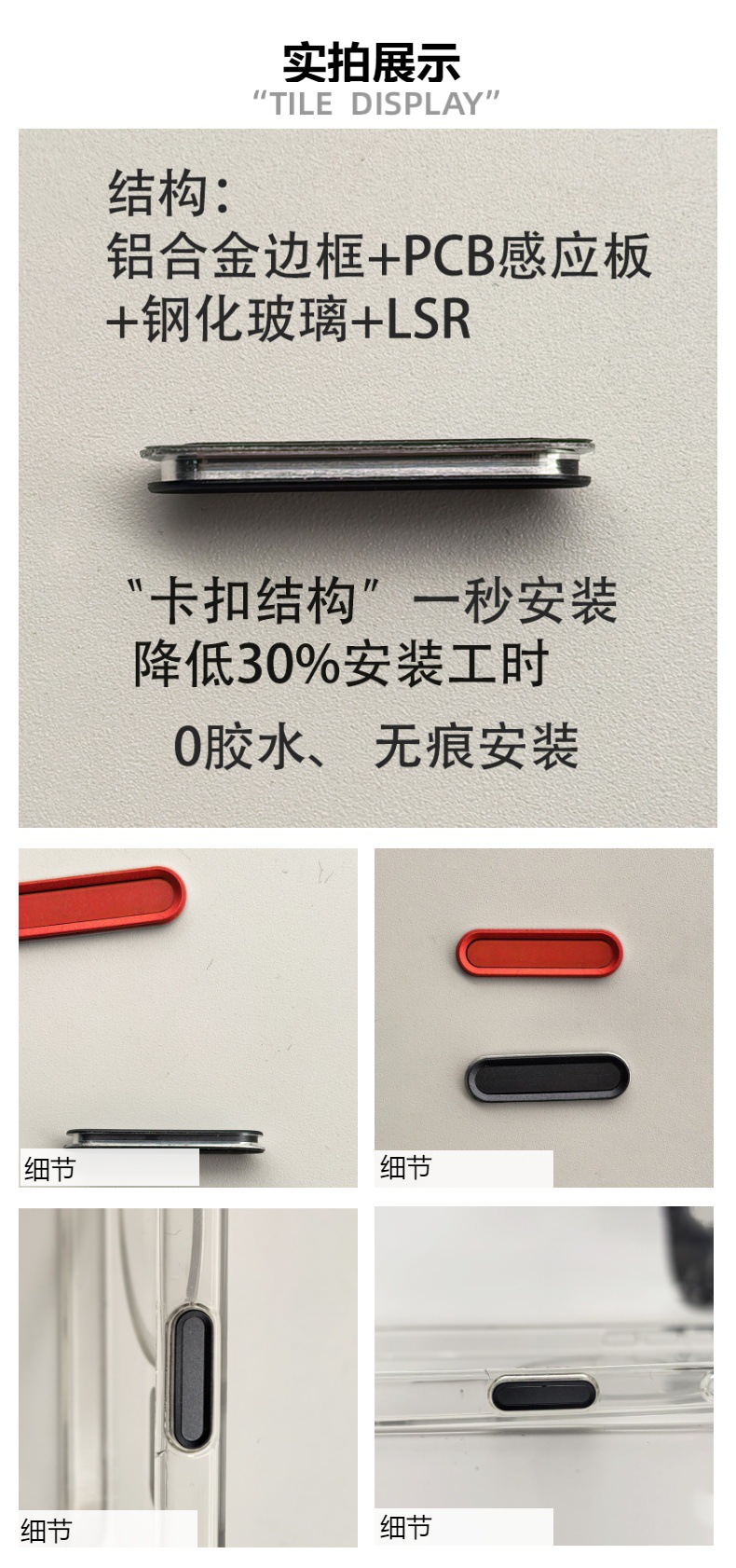 钢化玻璃 + 铝合金边框 + PCB导电感应 + LSR(液态硅胶)
