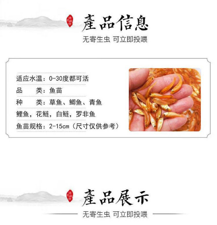 ![]() | Peacock blue zhongke crucian carp 2-4cm 200 pieces | ¥39.6 / ≈ 482 ₽ | 200 | 5910103026548 | |