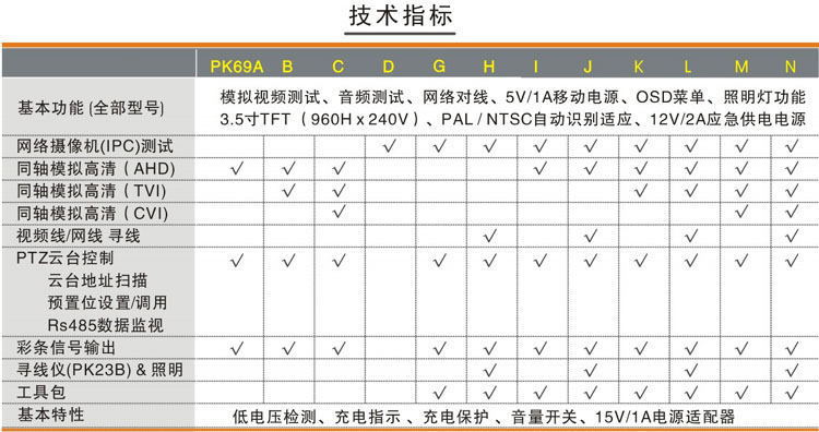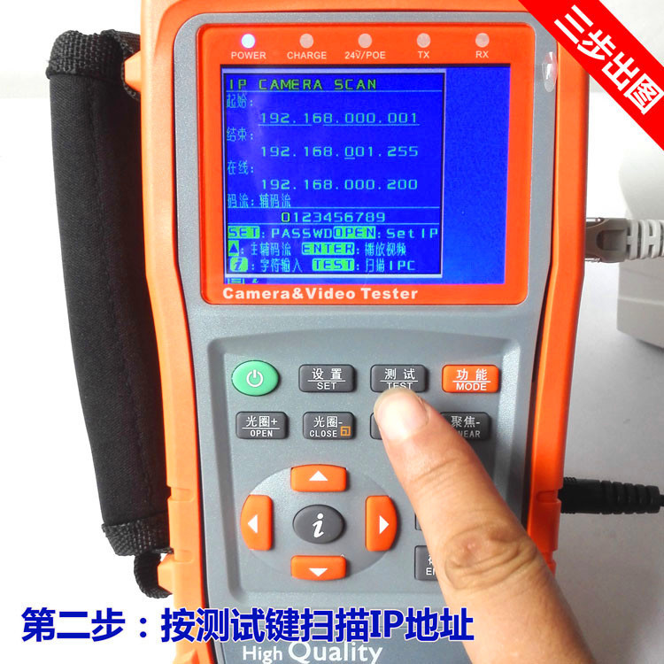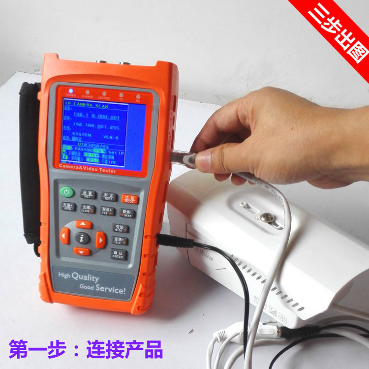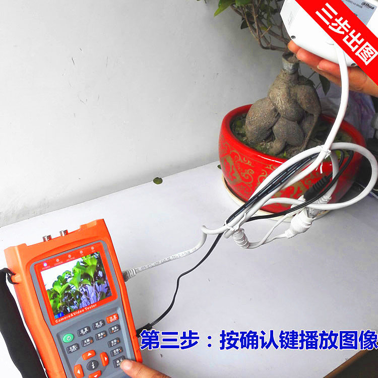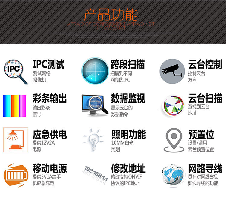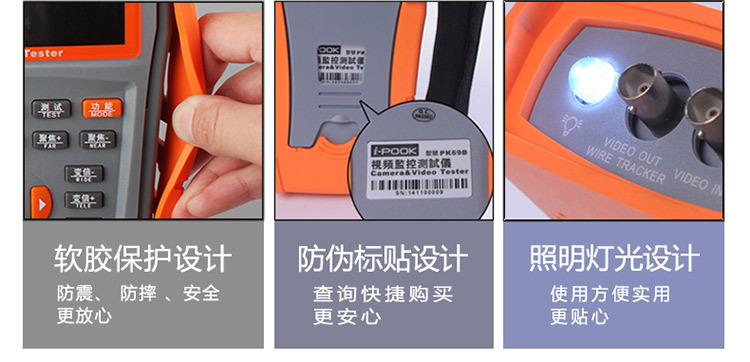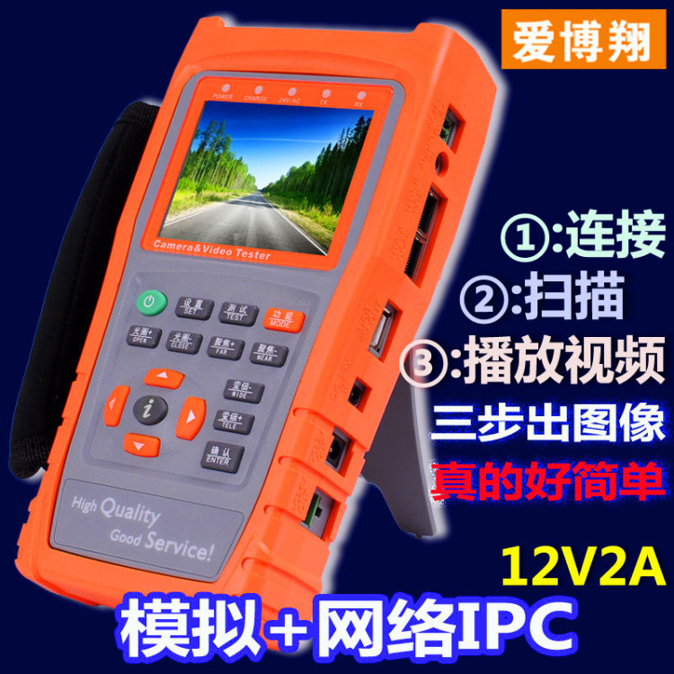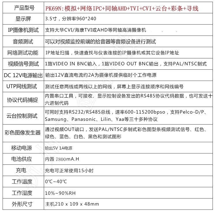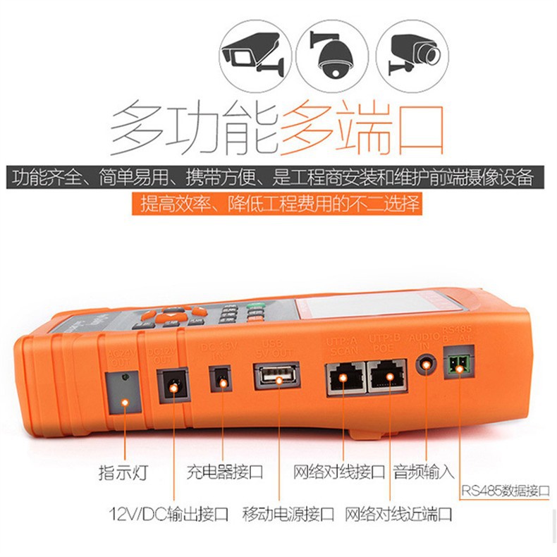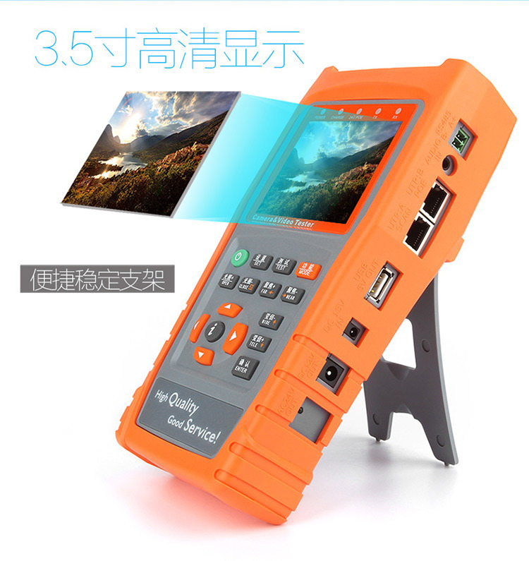 3.5寸液晶屏 中英文OSD菜单 视频测试 音频测试 移动电源5V1A 应急电源12V2A 网络对线、云台预置位 、云台控制 、视频彩条输出、数据监视、网络摄像机(IPC)测试、模拟摄像机测试,跨段IP地址扫描功能+(AHD同轴高清+海康同轴TVI+大华同轴CVI)+寻线功能 :操作简便3步完成--(连接、扫描IP、播放图像)