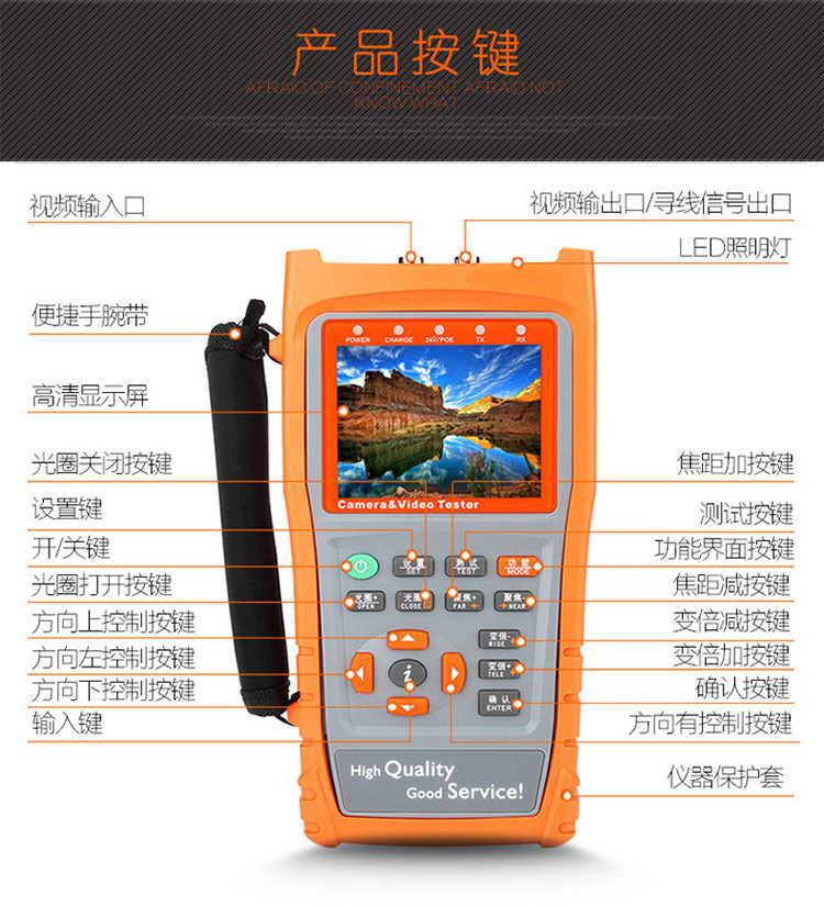 本仪器是为视频监控现场安装、维护而开发的测试工具,网络摄像机(IPC)和模拟摄像机视频显示测试、网络摄像机(IPC)地址扫描、网络摄像机(IPC)鉴权测试、网络/视频线路寻线、PTZ云台控制、PTZ云台地址扫描、RS485数据捕捉、DC12V/2A电源输出、音频测试、彩条图像发生器、网线测试、移动电源等功能。