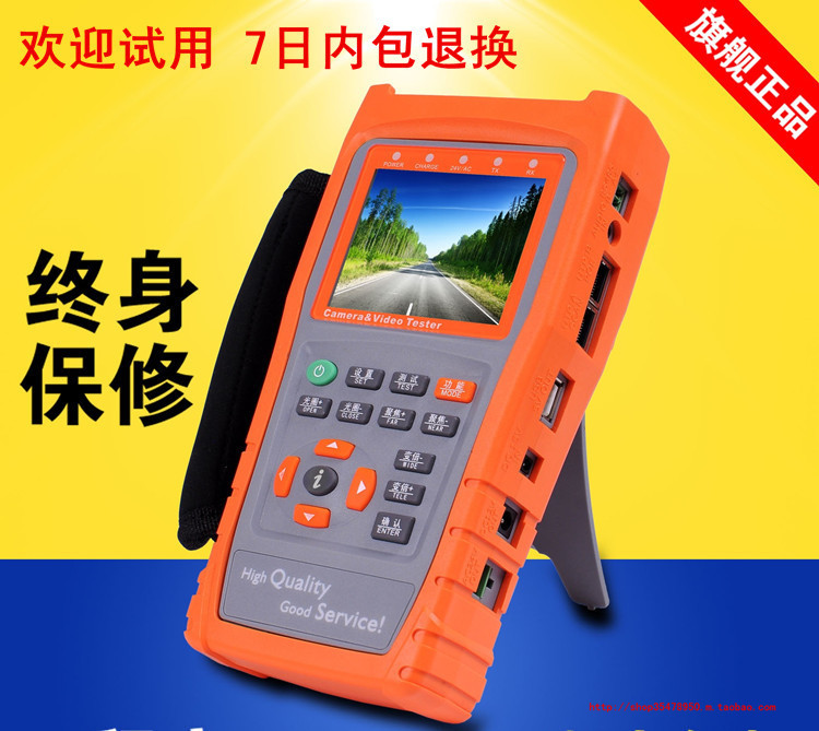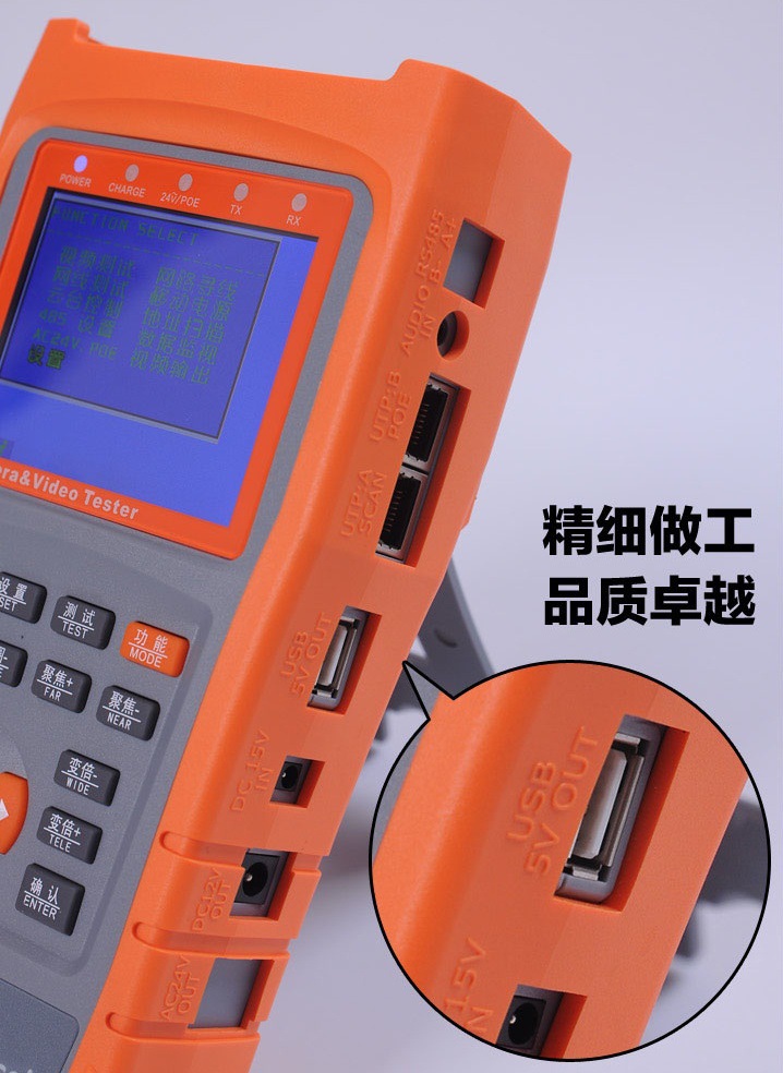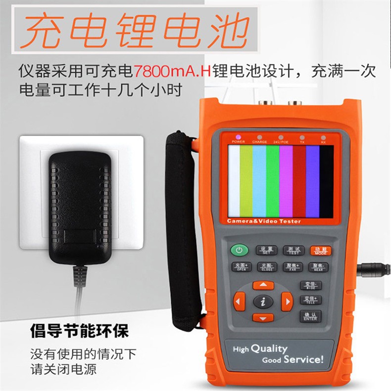 视频监控测试仪,内置高清晰3.5寸(分辨率960*240)大屏幕数字LCD监视器,通过该仪表的VIDEO IN接口连接前端摄像机,可直观方便地看出摄像机图像效果。LCD监视器亮度、对比度可调,适合野外施工和维护;