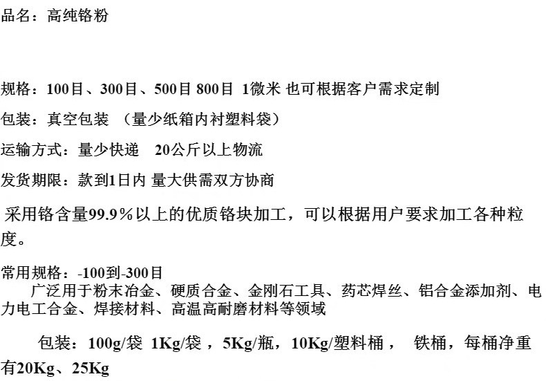 📦 | 300-500 mesh high purity ultra-fine chromium powder (500g) | ¥95.0 / ≈ 1 156 ₽ | 9999999 | 5753443196974 | |
