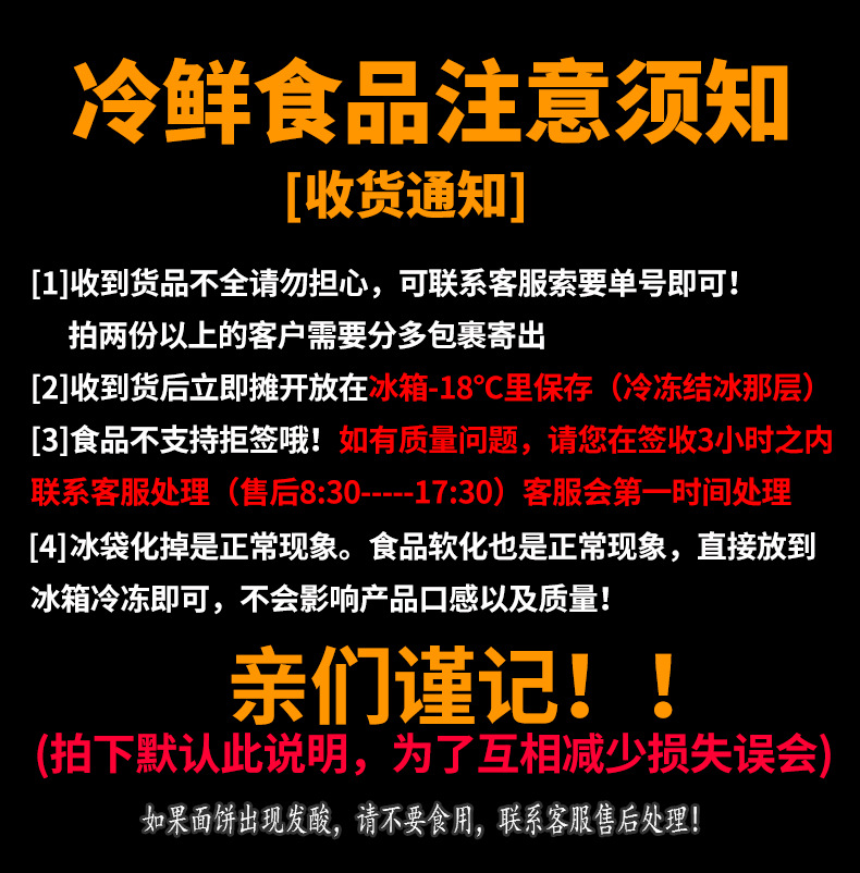 注意:冷冻品出单号后就不支持退款,出单号即代表已发货,麻烦确认好再下单。发出后改地址或没有及时签收造成的货品损坏商家概不承担!!
