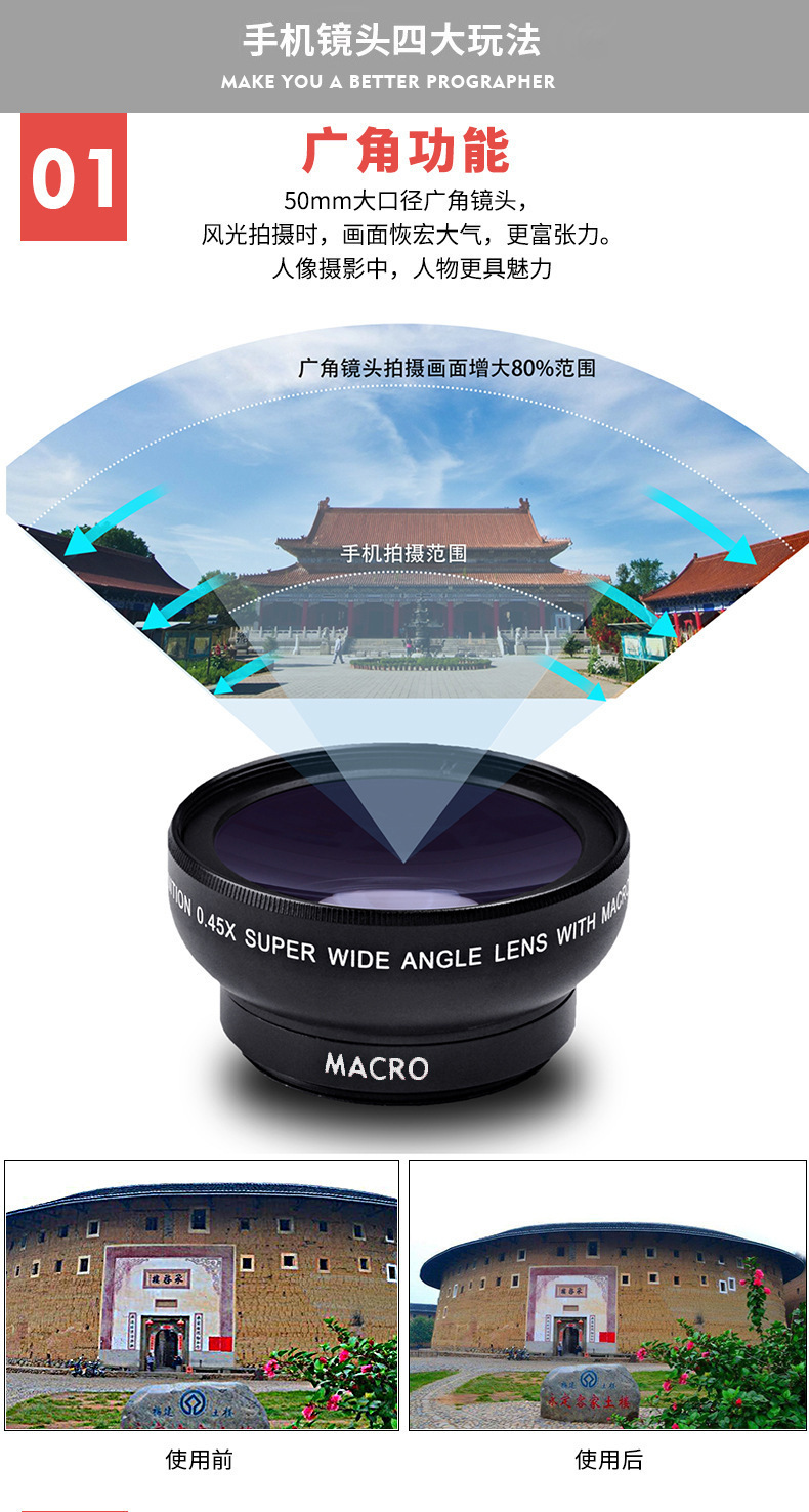 0.45X широкий угол, 15X макро, HD, оптовая продажа