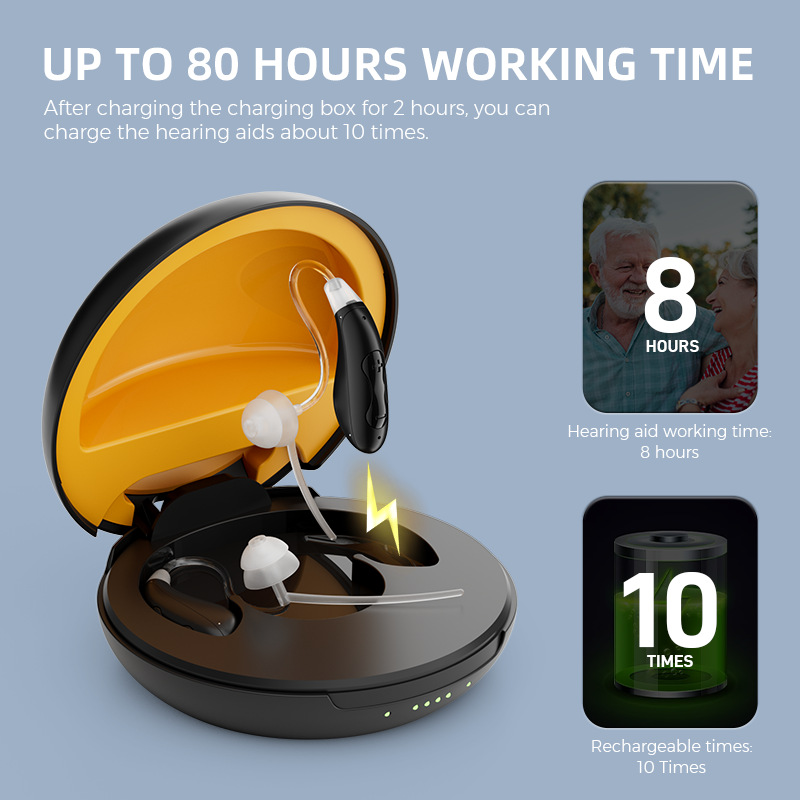 5. Up to 100 hours working time, the charging box can charge the hearing aids 10 times.