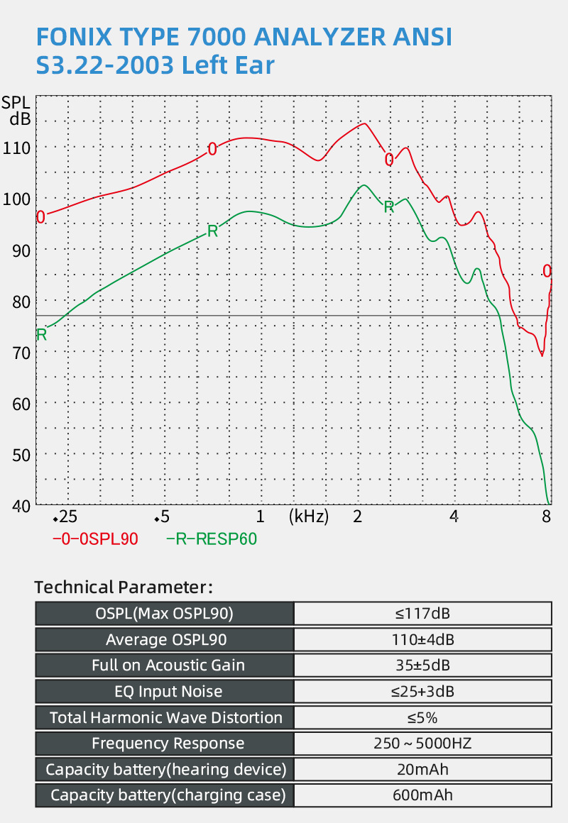 Gross weight: 14.5KG OSPL(Max OSPL90) 117dB USB charging voltage 3.7V Average OSPL90 107dB Hearing aid battery capacity 22mAh Full on Acoustic Gain 35dB±5dB Charging box battery capacity 600mAh EQ Input Noise ≤25dB Full battery use time(hearing aid) 10 hours Frequency Response 250Hz~5000Hz Hearing aid charging time 2 hours Harmonic Wave Distortion ≤5% Environment modes indoor, outdoor 。