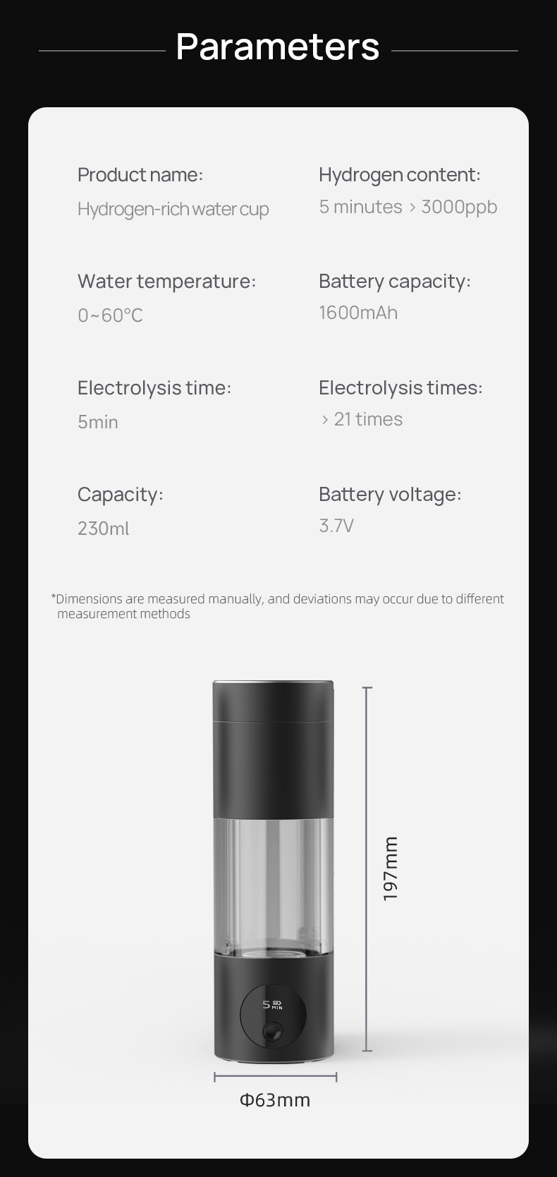 Product parameters Size: diameter: 63mm height 197mm net weight: about 470g capacity: about 230ml working time: 5min