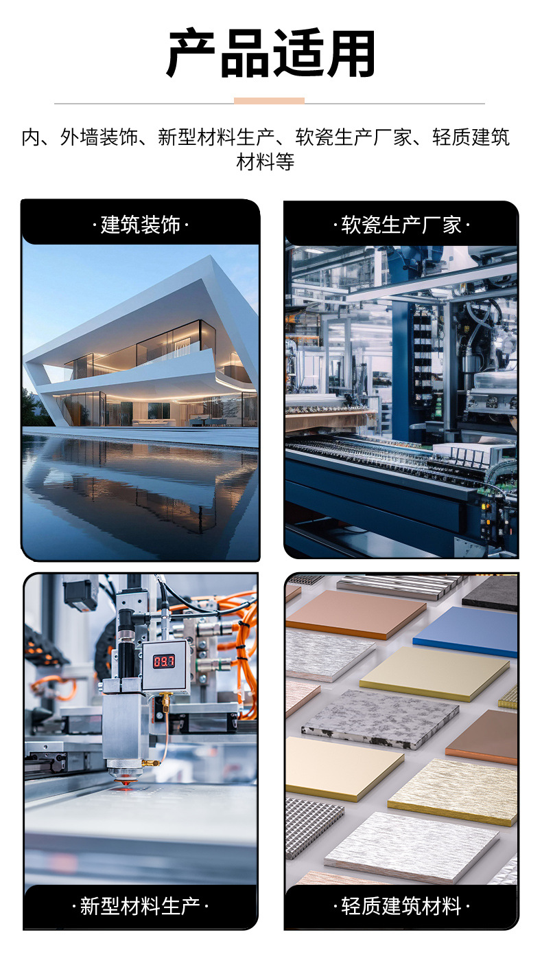 Применимые отрасли Interior and exterior wall decoration, new material production, soft porcelain manufacturers, lightweight building materials, etc