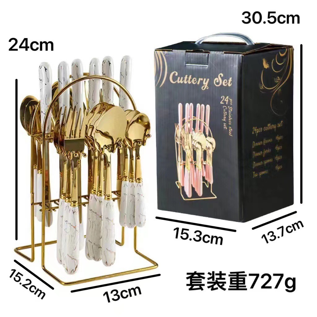 ![]() | Black gold/imitation porcelain handle model [knife and fork + large and small spoons + storage rack 24-piece set] | ¥24.81 / ≈ 302 ₽ | 485 | 5928257834583 |