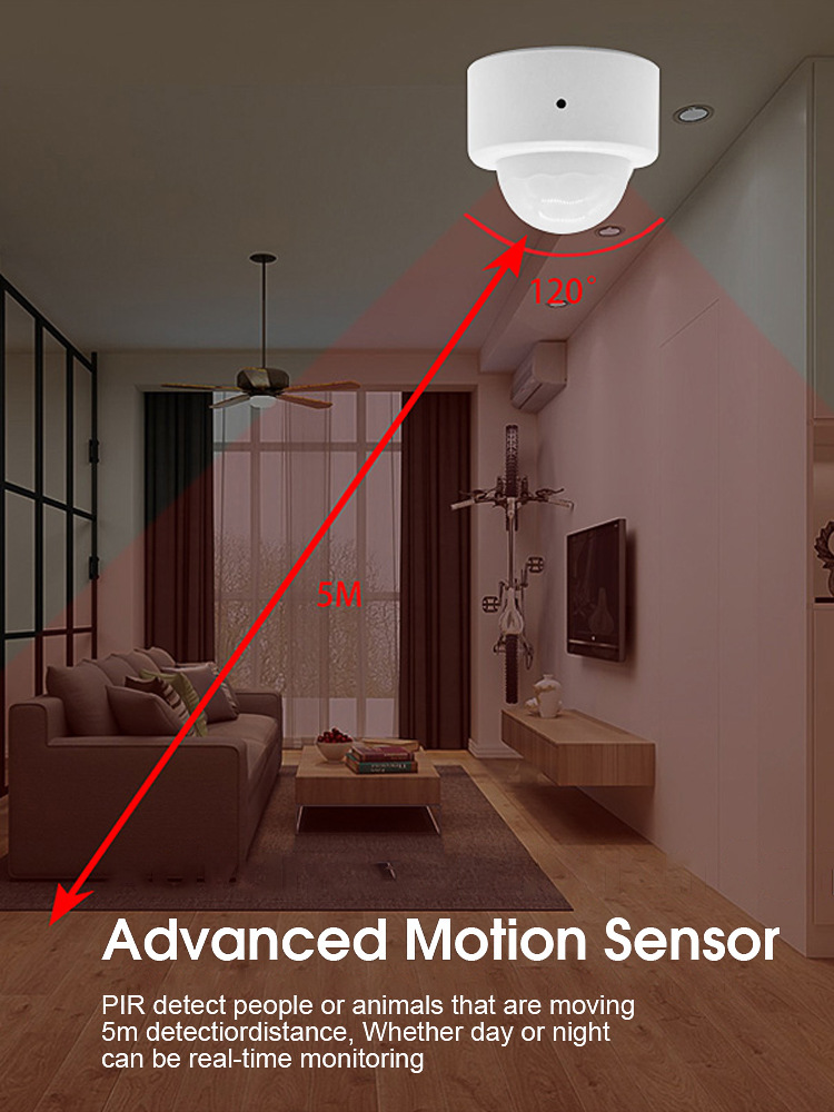 【先进的运动传感器】PIR检测正在移动的人体或动物,120°检测角度,5m检测距离,可实现白天或夜间实时监控。