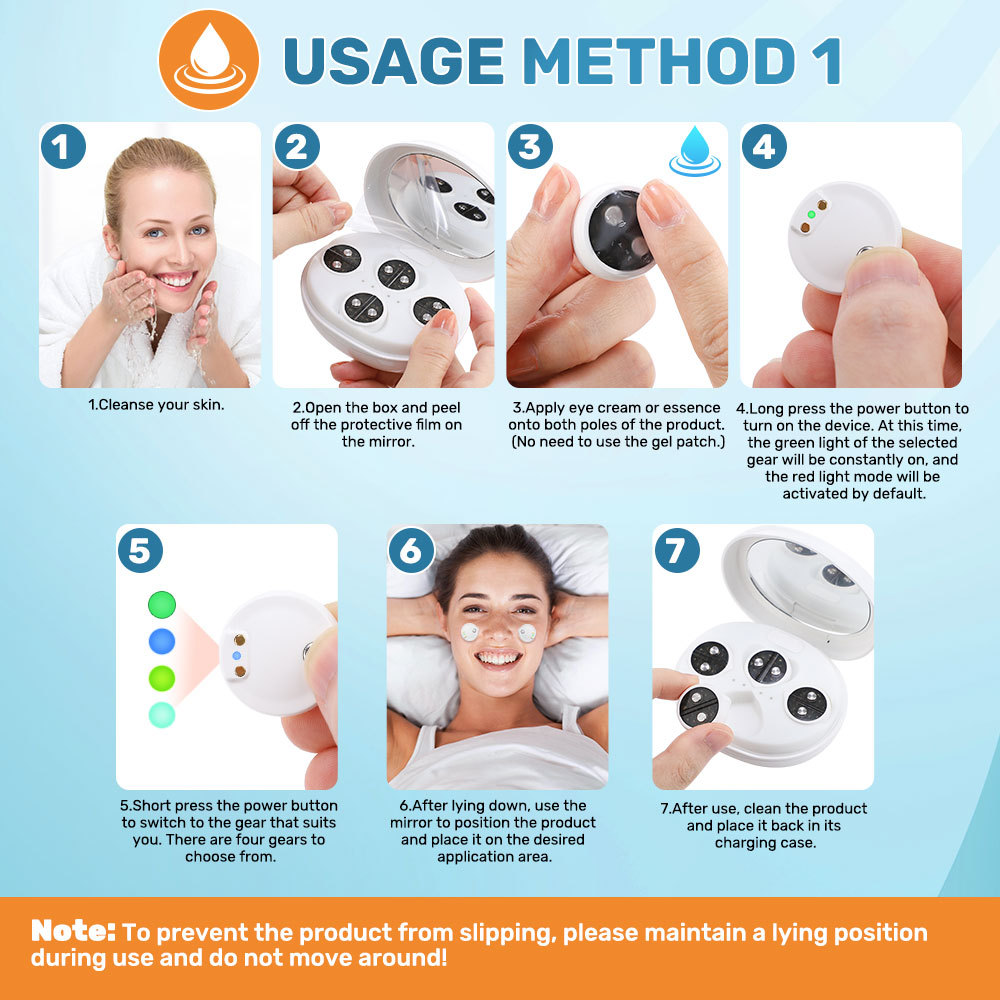 第一种1.清洁使用部位 2.打开盒子撕掉镜子膜 3.产品贴上凝胶(如需反复使用请勿丢掉防尘纸) 4.选好模式利用镜子反射定位贴到使用部位 5.产品用完后如需要反复使用贴上防尘纸。6.将产品放回充电盒