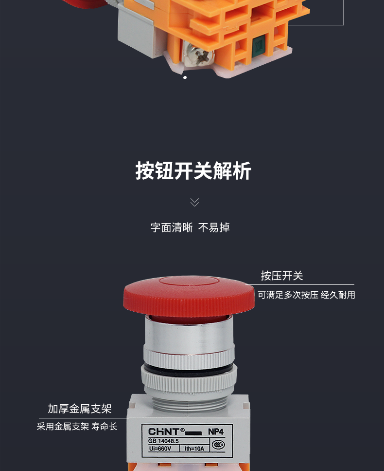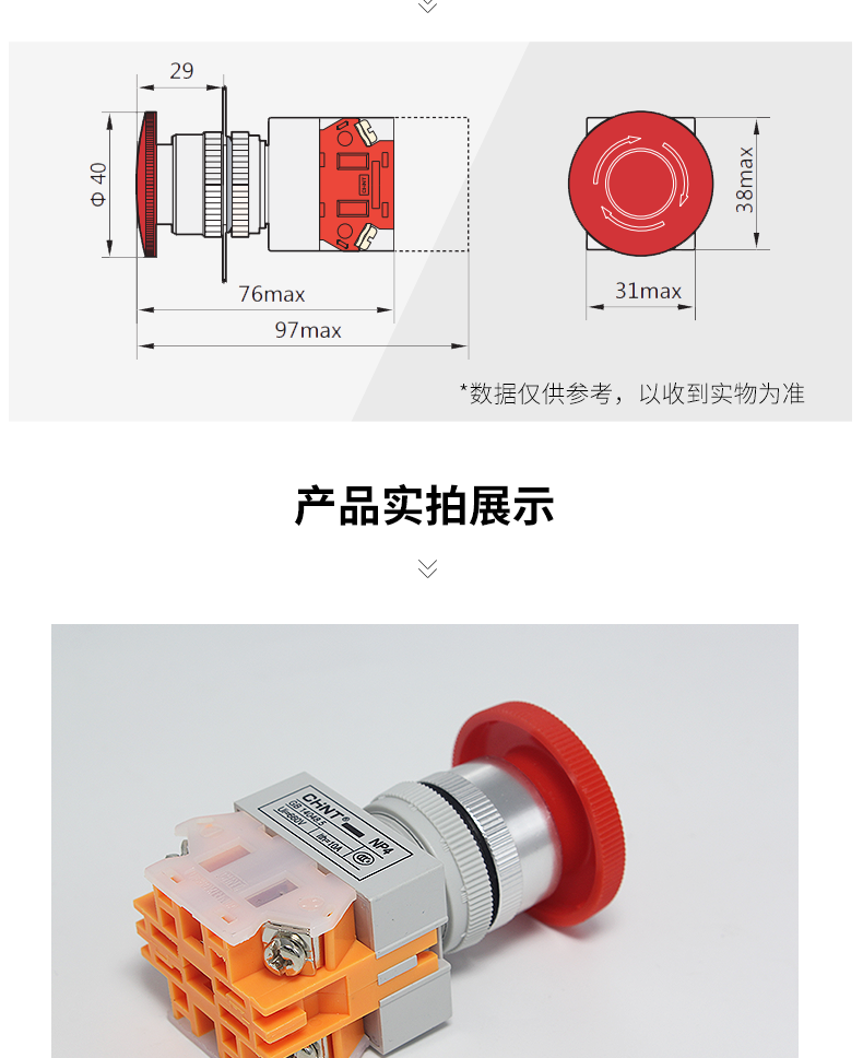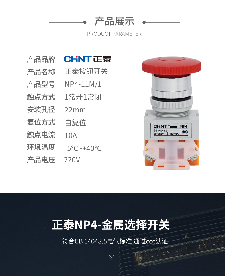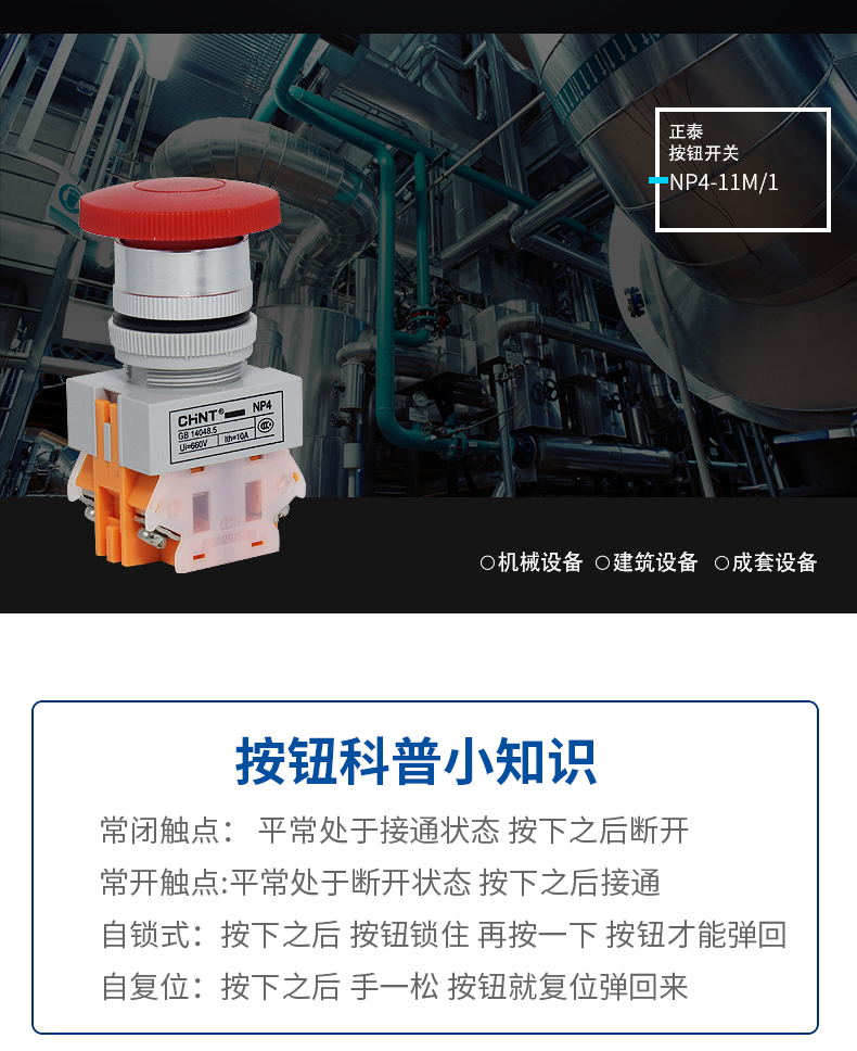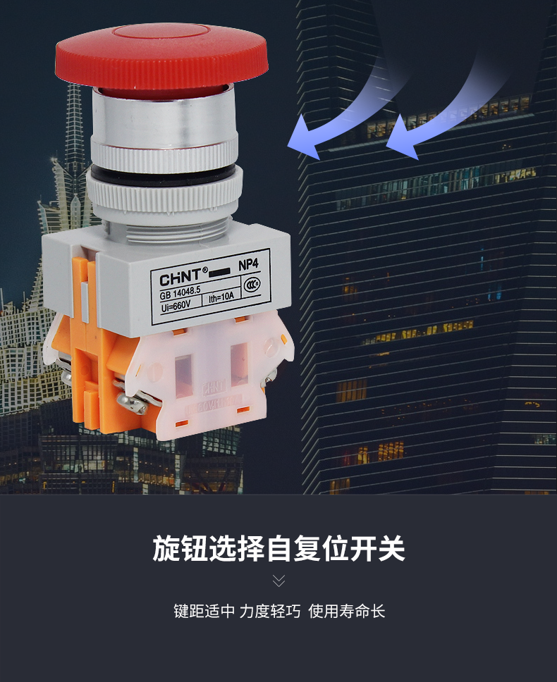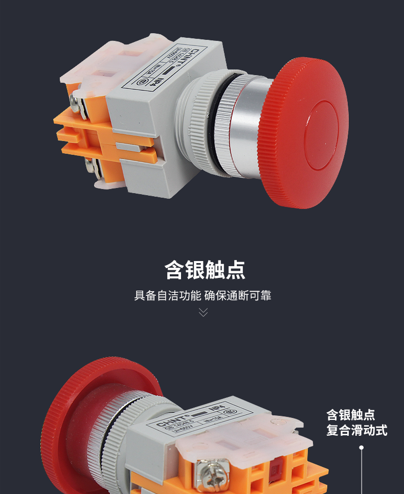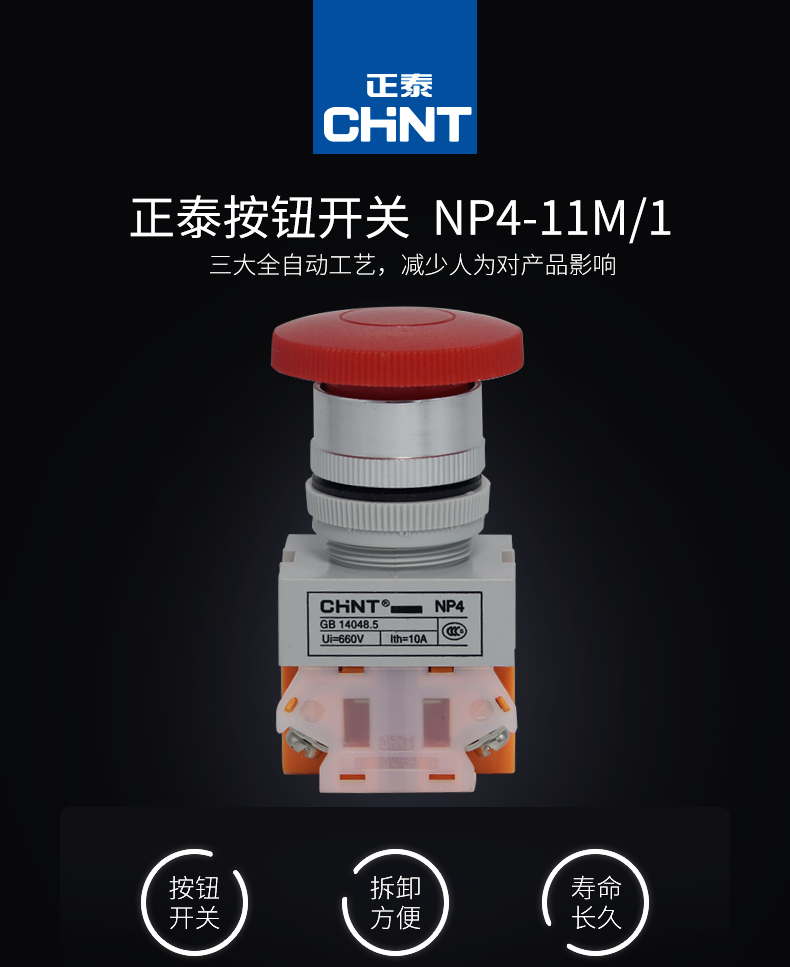 Кнопка переключателя Chint Np4-11M с грибовидной головкой, красная, самосбрасывающаяся, 1 нормально открытая, 1 нормально закрытая