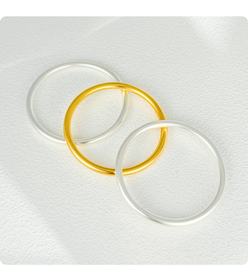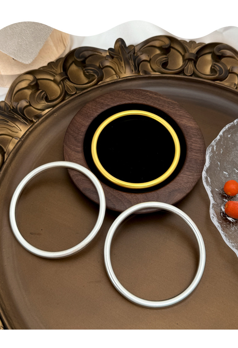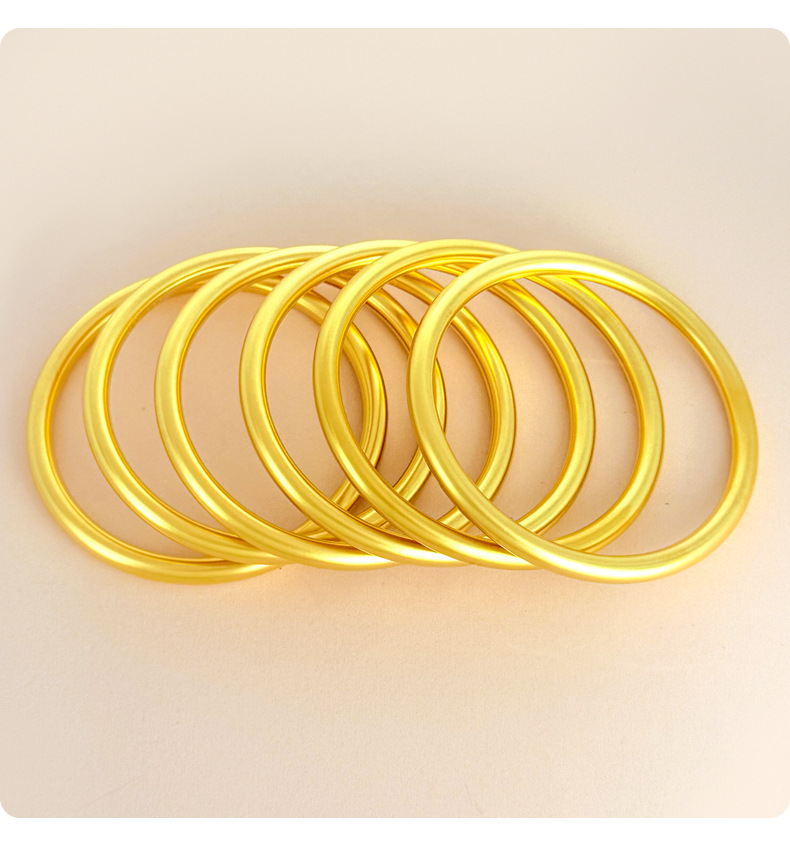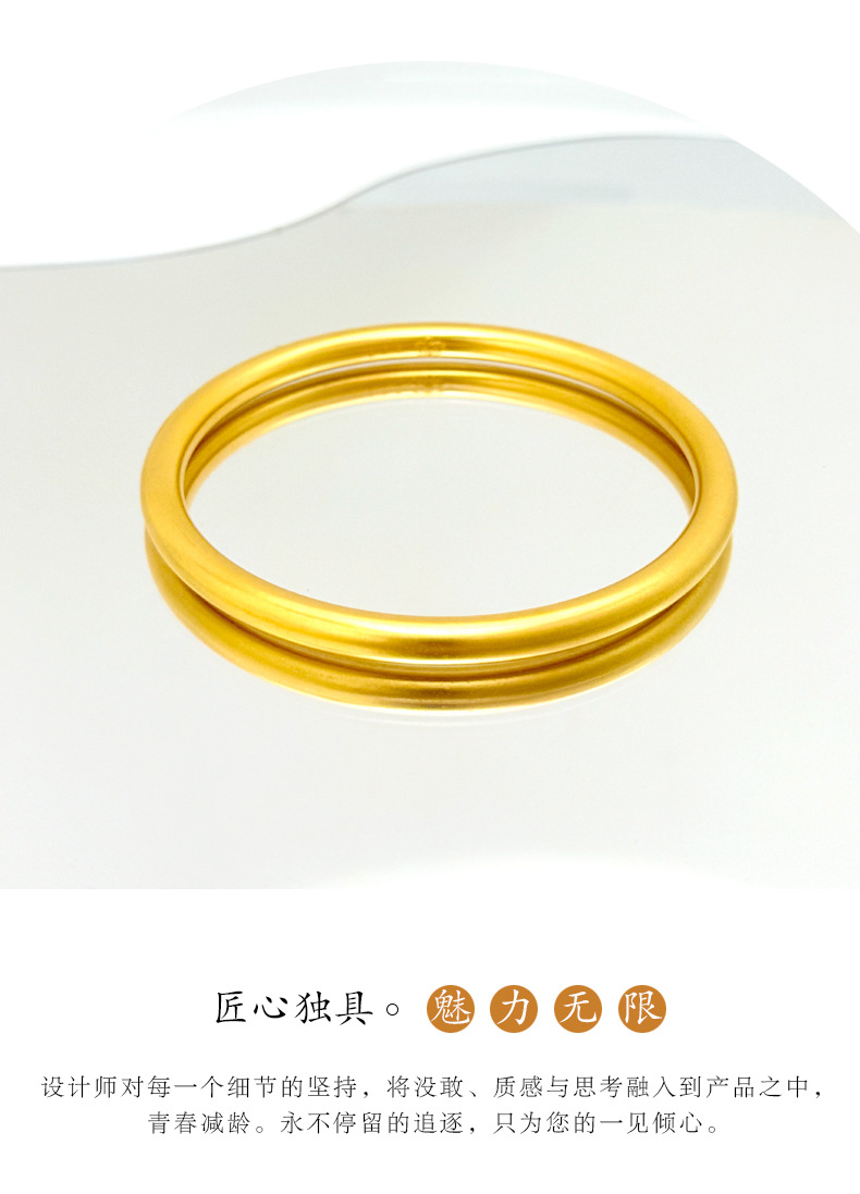光滑而流畅的线条感。每一个环形的设计,象征着圆满和无尽的美好,彰显出佩戴者独特的品位与内涵。金色的光泽不仅传递出奢华感,还与现代女性追求自信与独立的精神相契合。整体造型简洁而现代,古法素圈设计, 去除了冗余的装饰,让佩戴者的手腕成为唯一的焦点。手镯可单独佩戴也可多个叠加佩戴,展现出多种佩戴风格,适应不同场合的需求。其经典的设计无论是日常佩戴,还是出席正式场合,均能与各种服饰搭配,突显出佩戴者的精致与优雅。
