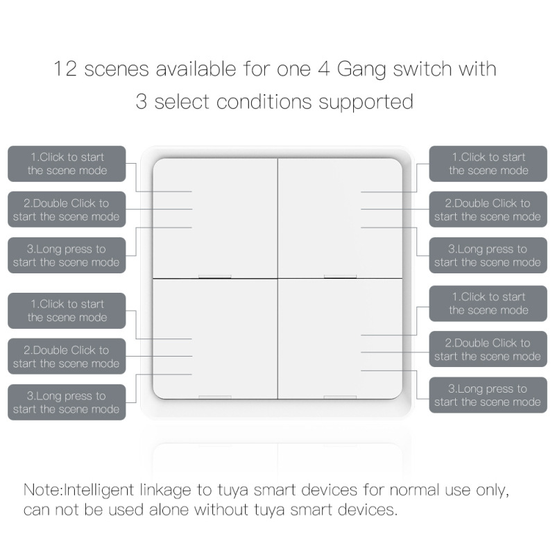 2.每个按钮有三种配对模式,如外出模式、家庭模式、电影模式等。要在智能手机应用程序上创建任何您想要的智能自动化,以开始您的另一种智能生活方式,当您厌倦了一天的工作时,无需再使用语音命令,无需再有时间打开应用程序,只需轻轻一触即可。