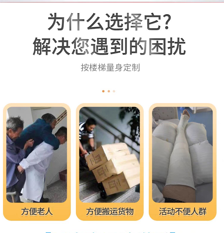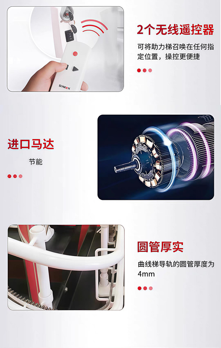 楼梯升降椅能帮助老年人或行动不便者独自上下楼梯,很好地解决了其上下楼不便的问题。该产品依靠安装于楼梯左侧面或右侧面的轨道运行,不破坏家庭的任何设施,尤其适合已经装修好的家庭。楼梯升降椅整体采用钢制结构、铝合金铸件及阻燃塑壳组合而成,性能外形时尚美观。