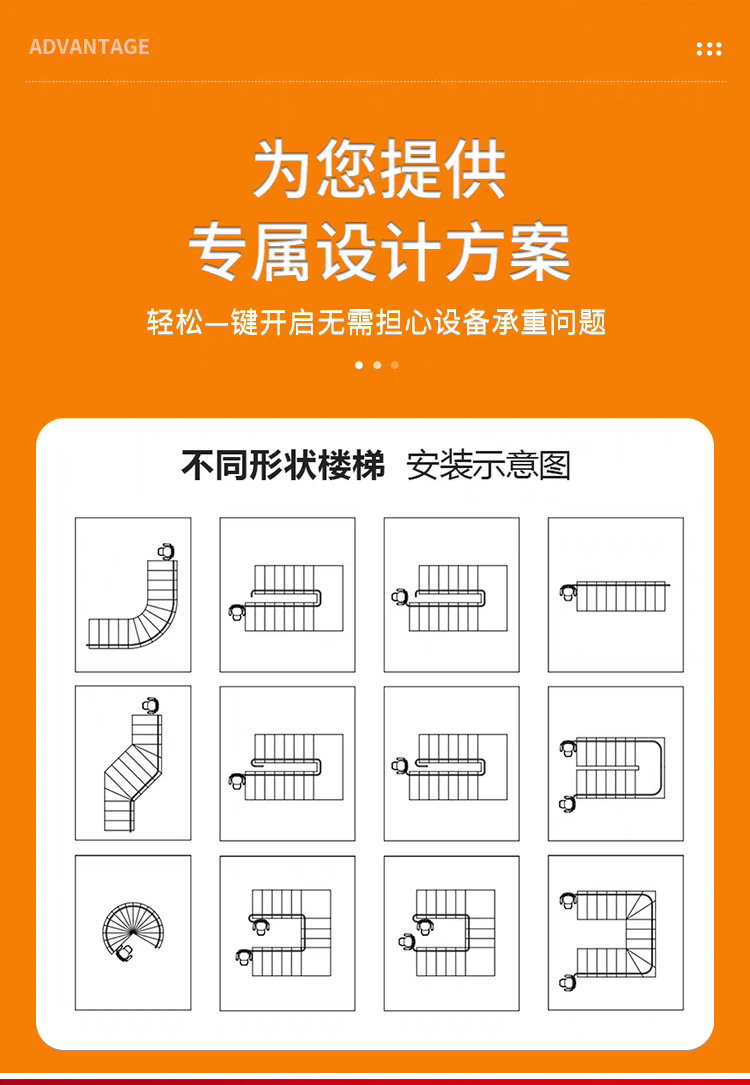 楼梯椅的电源为24V可充电电池,导轨的上端、下端设有自动充电位,必要时楼层的中间位也可设立自动充电位。·导轨按用户的实际楼层情况现场测绘后定制而成。