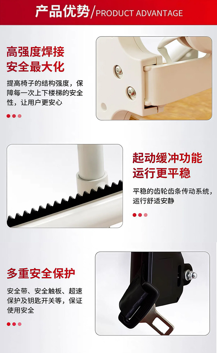 座椅电梯主机为金属塑料混合结构组合而成,座板支架、背板、扶手为铝合金模具压铸而成,坚固、,座垫和背垫为真皮海绵缝制而成,舒适、美观。●楼道电梯的升降原理为:齿轮、齿条低压蜗轮减速电机爬升驱动原理,平稳、。并设有防滑落、防脱落、 锁定装置,当座椅出现齿轮磨损、脱落时滑落锁紧装置会自动打开,的将座靠在轨道上,有效地保证乘坐者的人生、