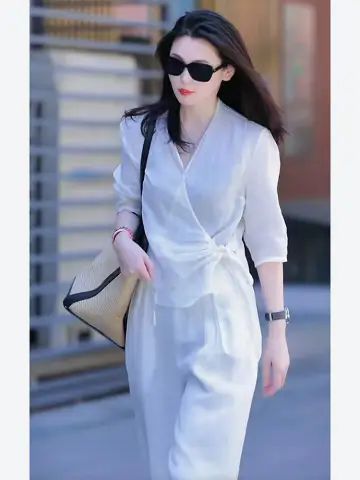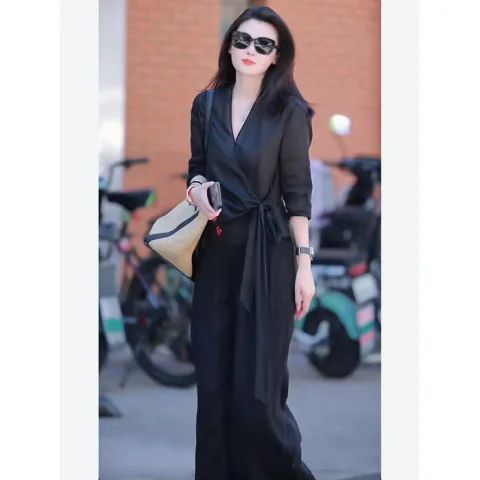 Двухкомпонентный комплект для женщин 2025 лето новый продукт литературной моды, дизайн, уменьшающий возраст, рубашка с V-образным вырезом и универсальные широкие брюки с завышенной талией