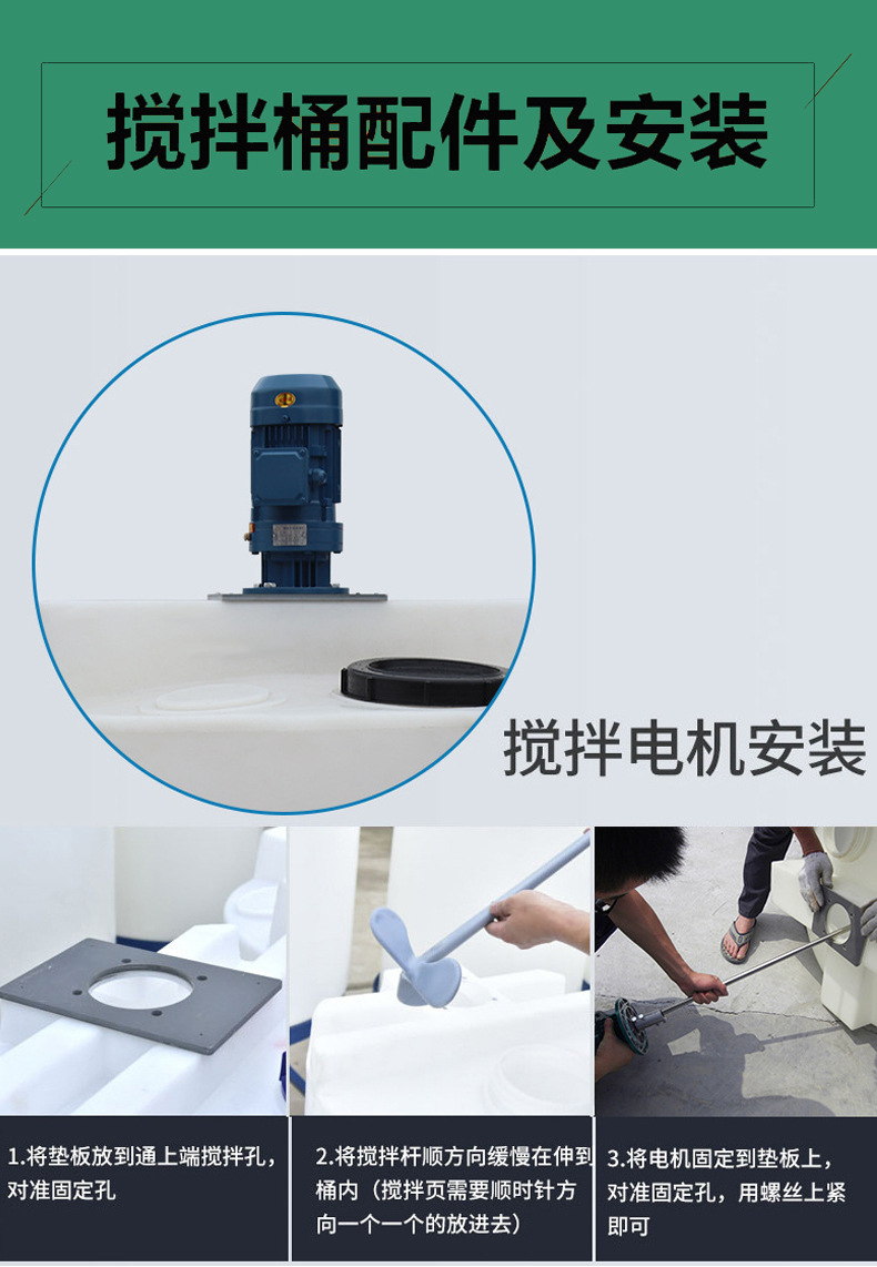 搅拌桶(又叫加药箱,搅拌罐,溶药桶等等)是聚乙烯pe材质制成,滚塑一次成型,无接缝,不渗漏,易清洗,耐酸碱,使用时间长,符合环保要求等优点! 另外可以配置计量泵,液位计,搅拌机,控制柜,出水口阀门等配件。常用在水处理,化工,施肥融药,日化洗涤剂,切削液,洗洁精,洗手液,PAM,PAC,阻垢剂等行业领域!