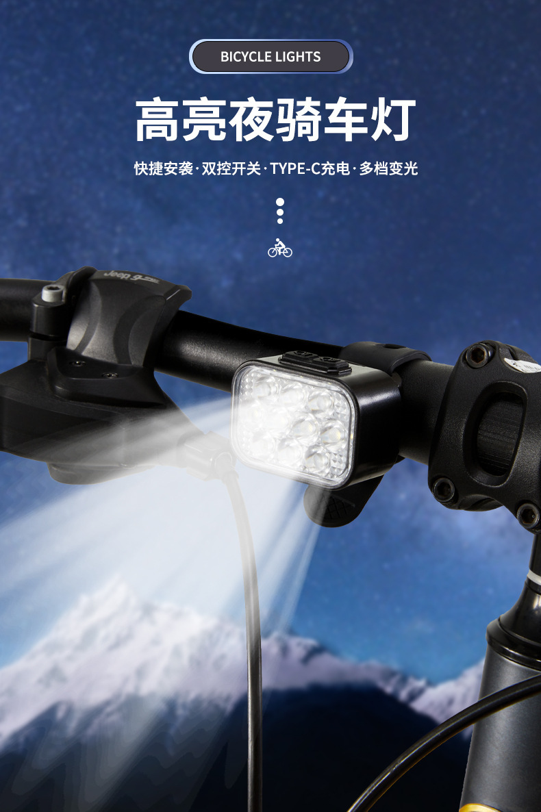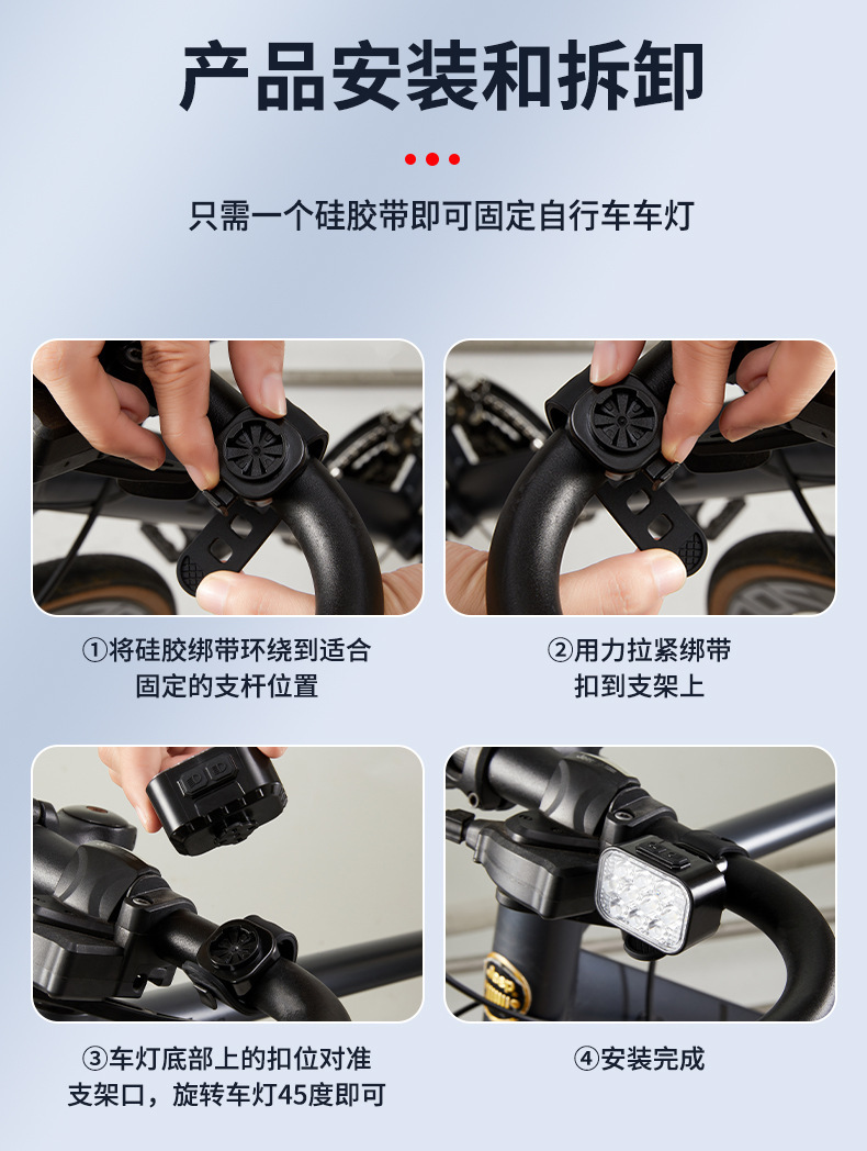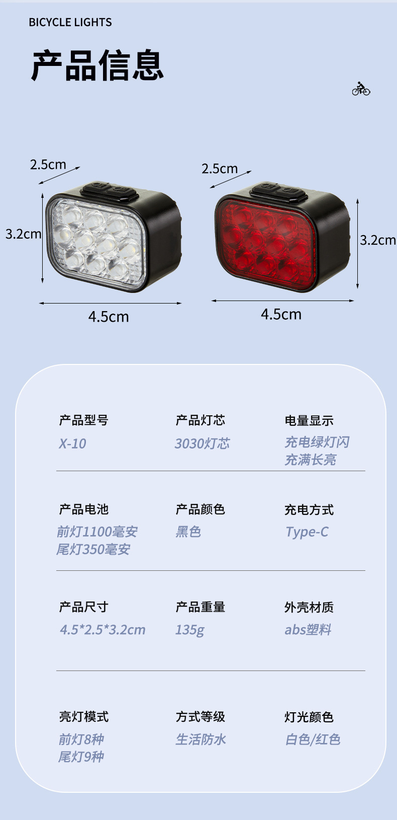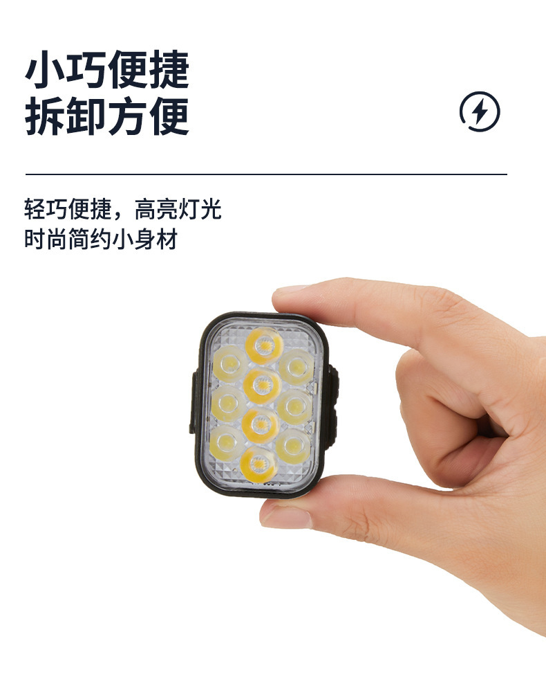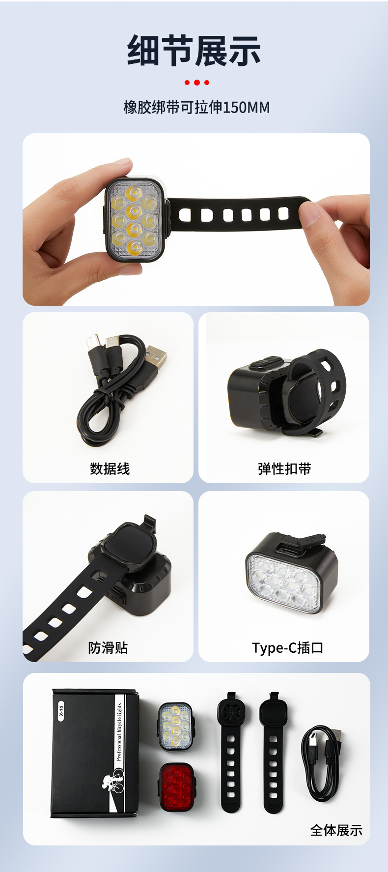 X-10 套装(前灯,尾灯,绑带*2,一开二Type-C线) 装箱数120套/38.5*27*53cm/18.5kg 包装尺寸:12.5*8*3.5cm 毛重:144g