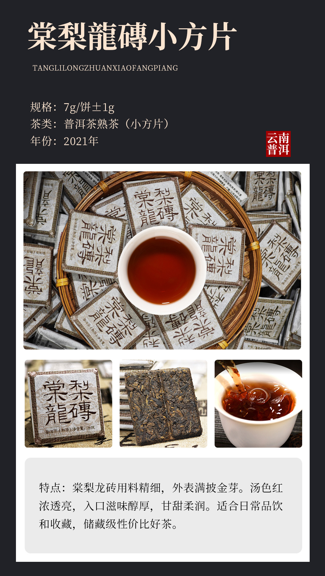 ![]() | Small square piece-273 tangli dragon brick pu'er ripe tea | ¥0.98 / ≈ 12 ₽ | 8009 | 5973552246059 | |