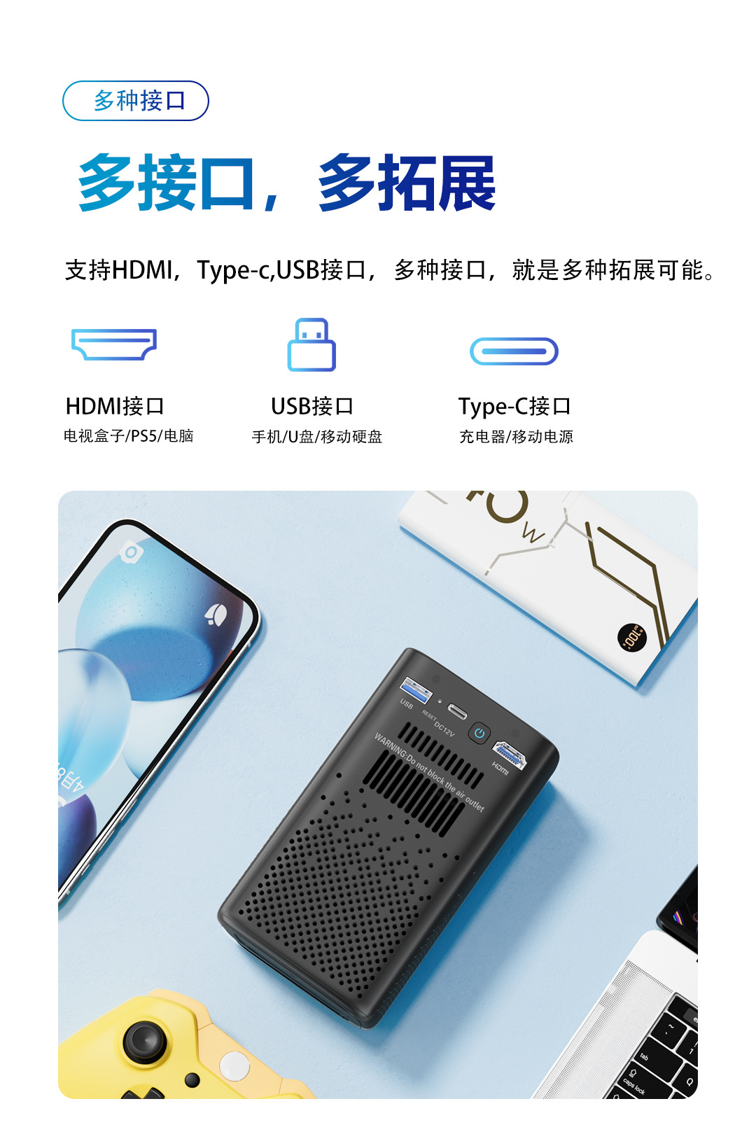 USB接口,音频接口,AC电源接口,HDMI高清线接口