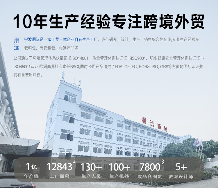 宁波朋远箱包有限公司成立于2017年,是一家汽车车载用品、箱包产品、婴童用品及其他日用产品集生产和贸易于一体的综合性、现代化工贸型企业。公司坐落于草席之乡而闻名的浙江省海曙区古林镇,地理位置优越、环境优美、交通方便,现有占地面积约 6000 平米,主营产品以汽车用品系列旗下拥有300余款产品(含汽车垫、汽车后背袋、汽车保护袋、汽车收纳盒、车载冰包)、各类箱包产品、随着市场需求量越来越大延伸到婴童用品(妈咪包、腰凳、抱巾等)产品为主。产品线众多、用户覆盖面广以内销和外销方式走进市场,凭借产品定制设计深受国内外客户的认可和一致好评。