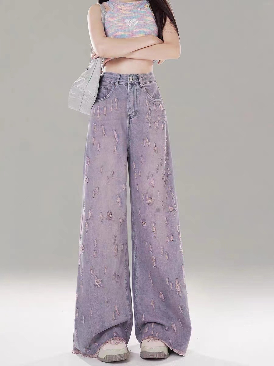 Розовые и фиолетовые джинсы с высокой талией для женщин, летний стиль 2025, рваные, драпированные