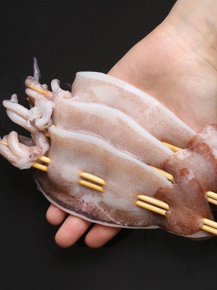 Шашлыки из большого кальмара на железной тарелке, ингредиенты для жарки, семейные коммерческие, свежие замороженные полуфабрикаты, бесплатная доставка