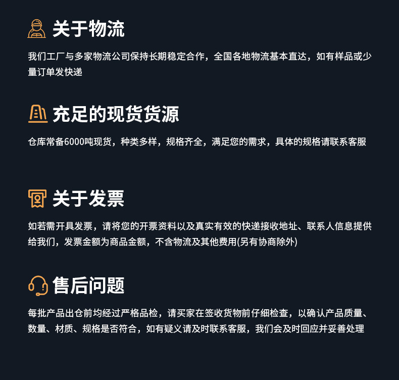 1.钢材市场波动较大、变化快,店铺价格可供参考,为了保障您的利益,拍单请提前和客服联系确定材质/价格/规格尺寸等相关信息,若无沟通直接下单的订单则视为无效订单,感谢您的理解与支持!