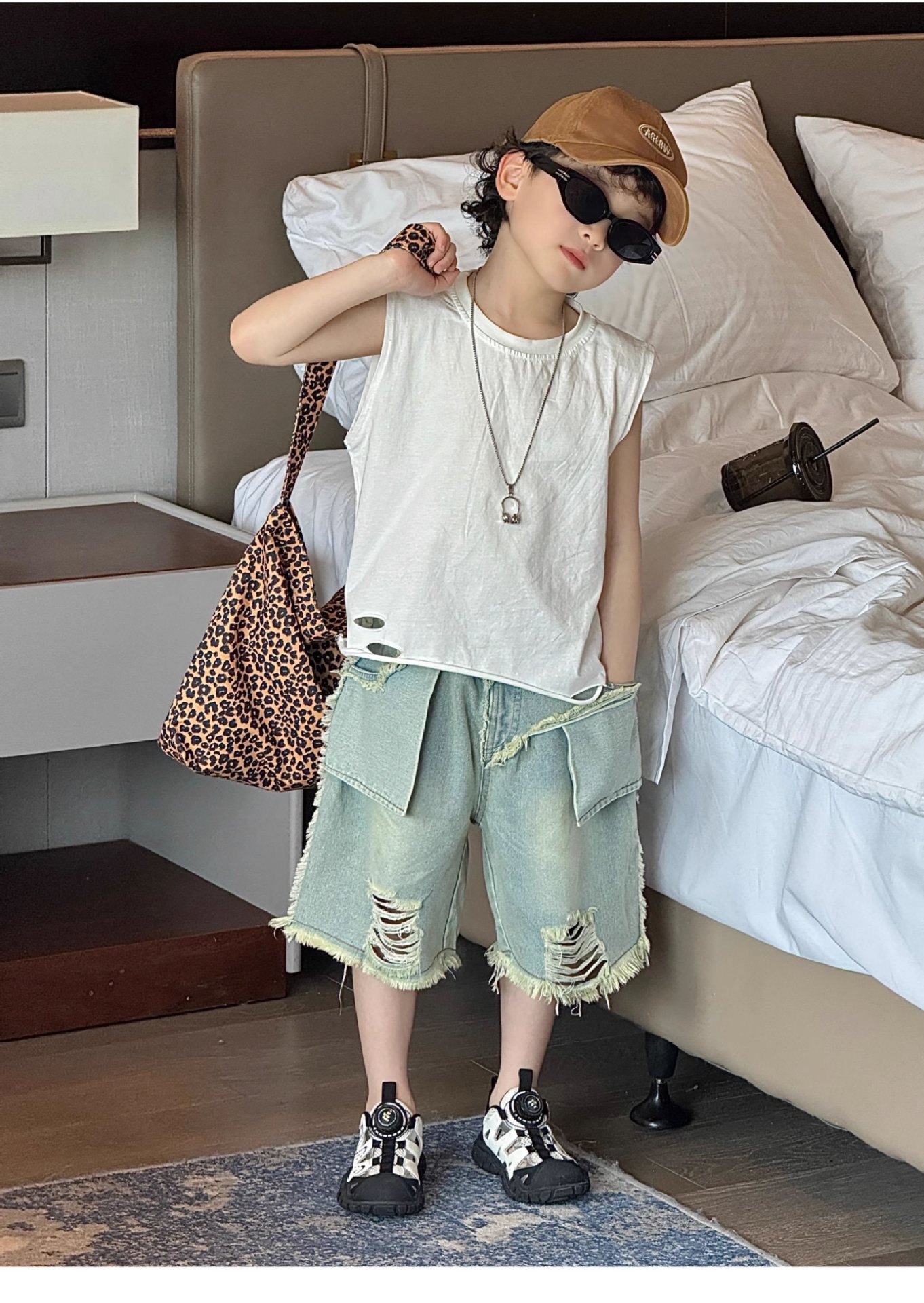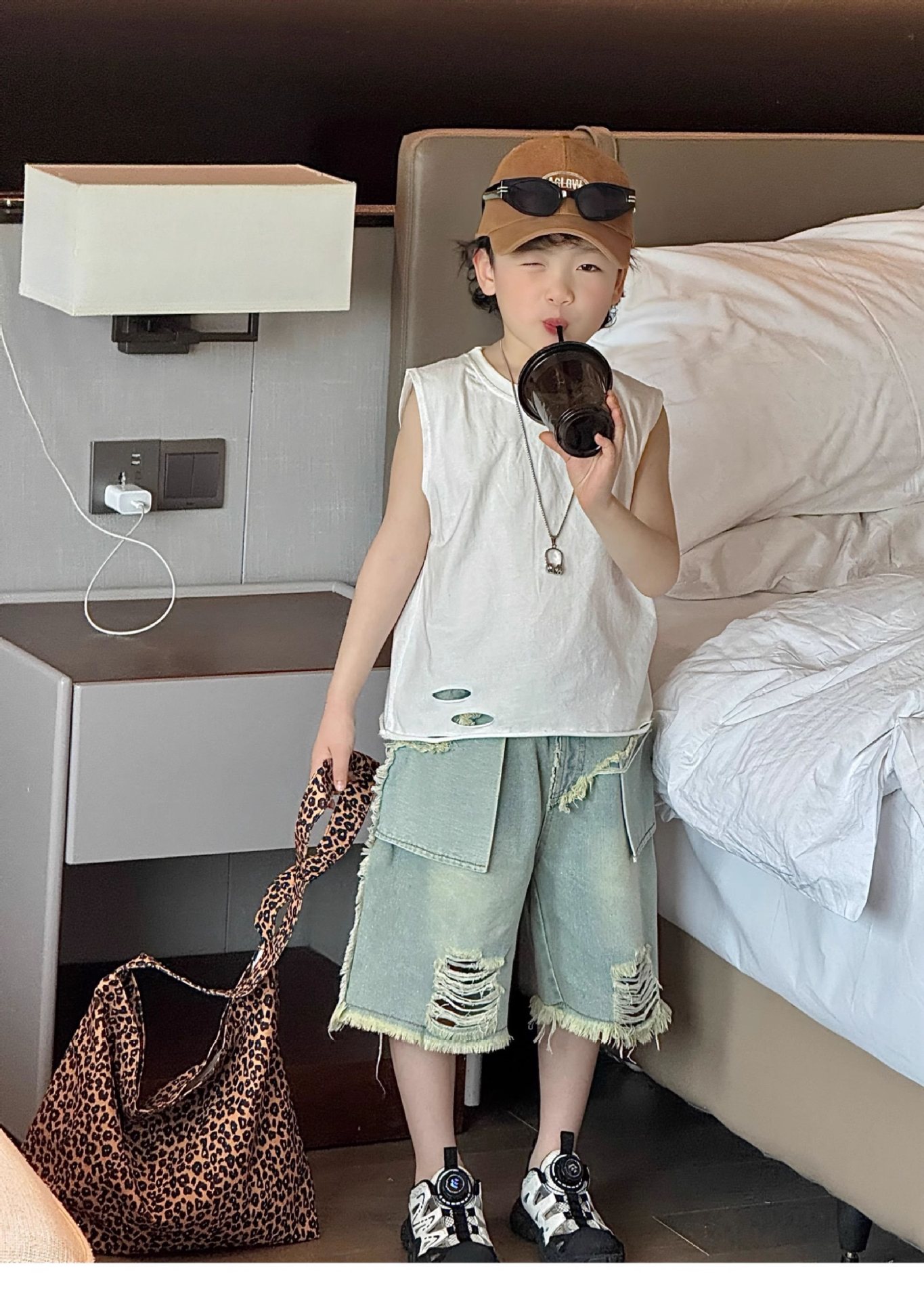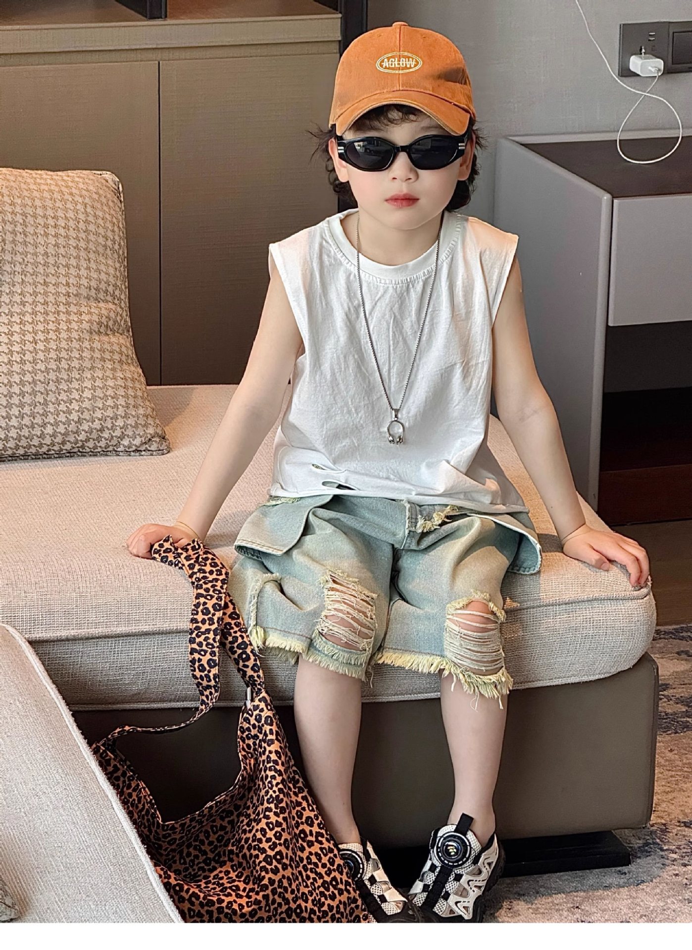 Мальчиковая летняя рубашка с коротким рукавом, безрукавный костюм, детская одежда, рваные джинсы для мальчиков