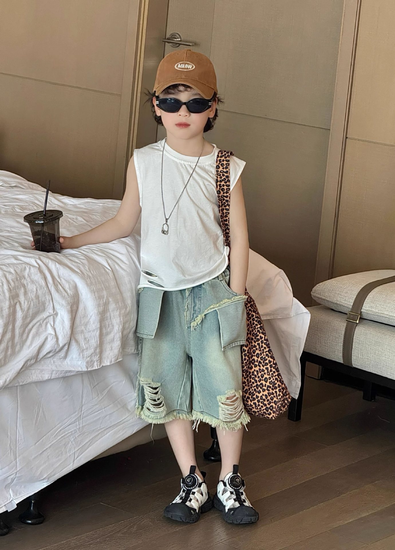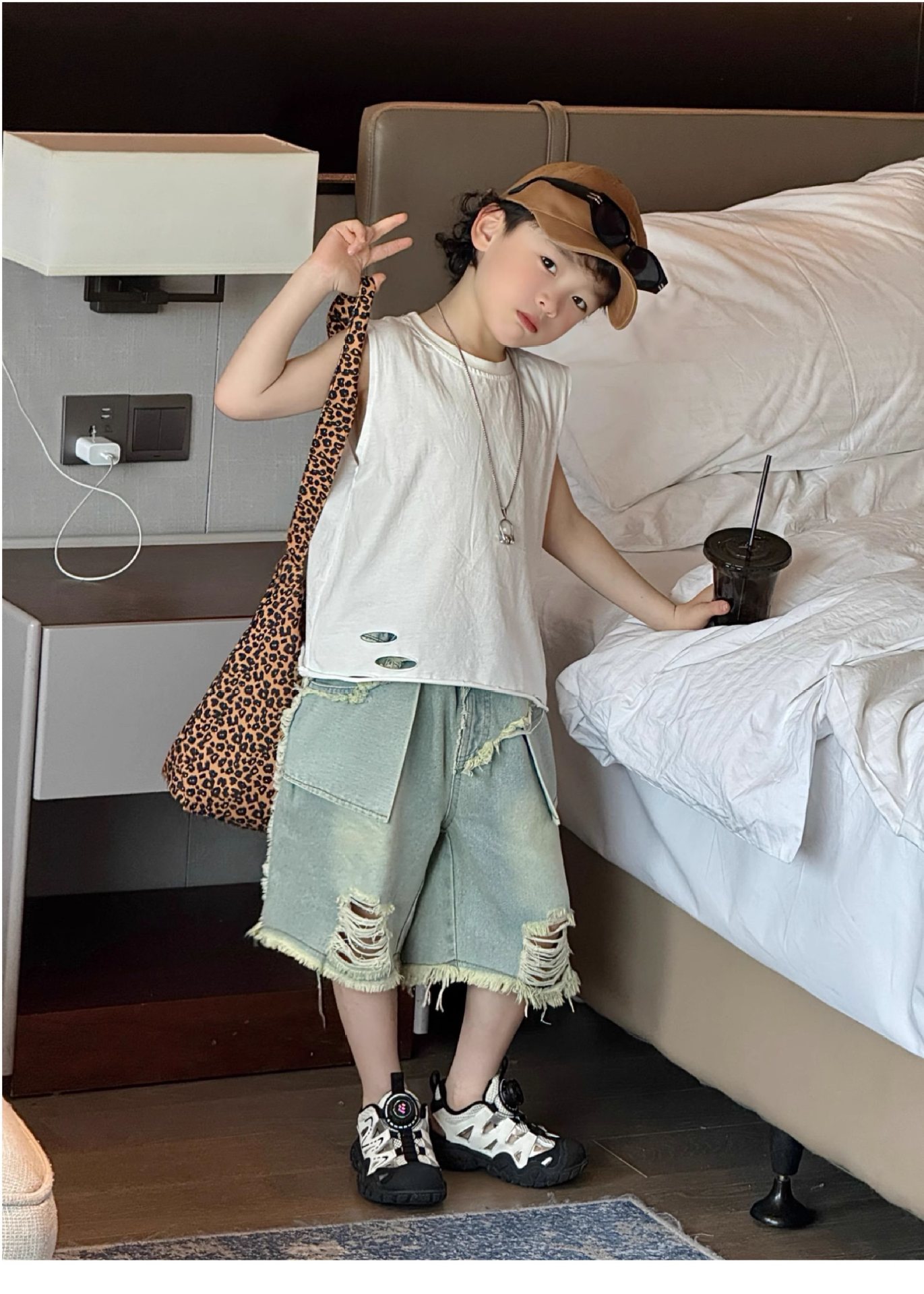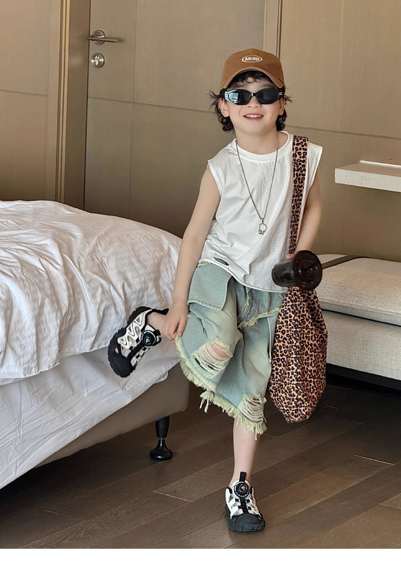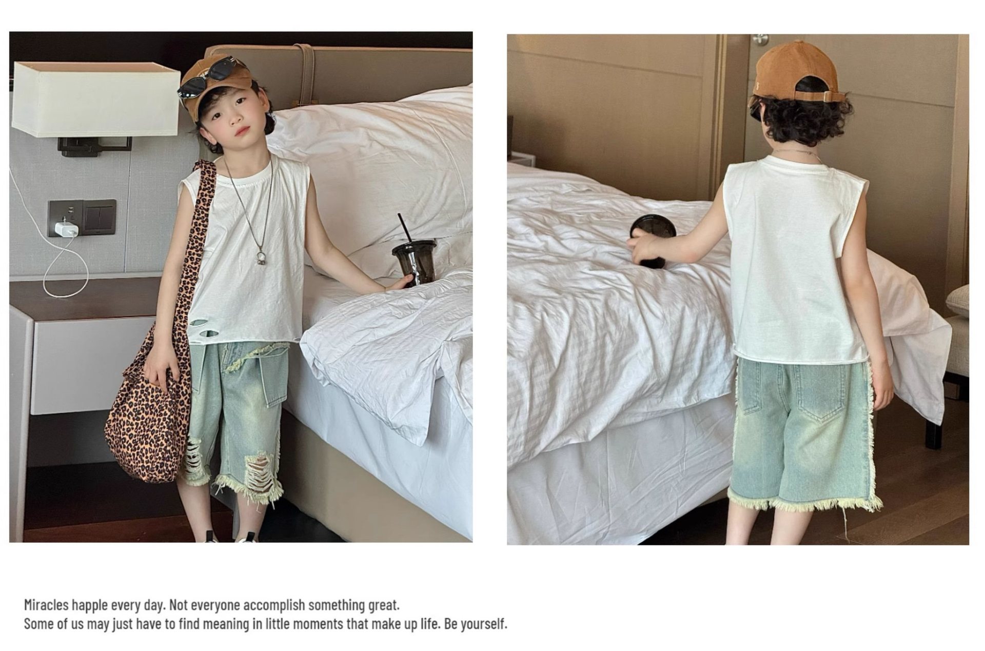 Мальчиковая летняя рубашка с коротким рукавом, безрукавный костюм, детская одежда, рваные джинсы для мальчиков