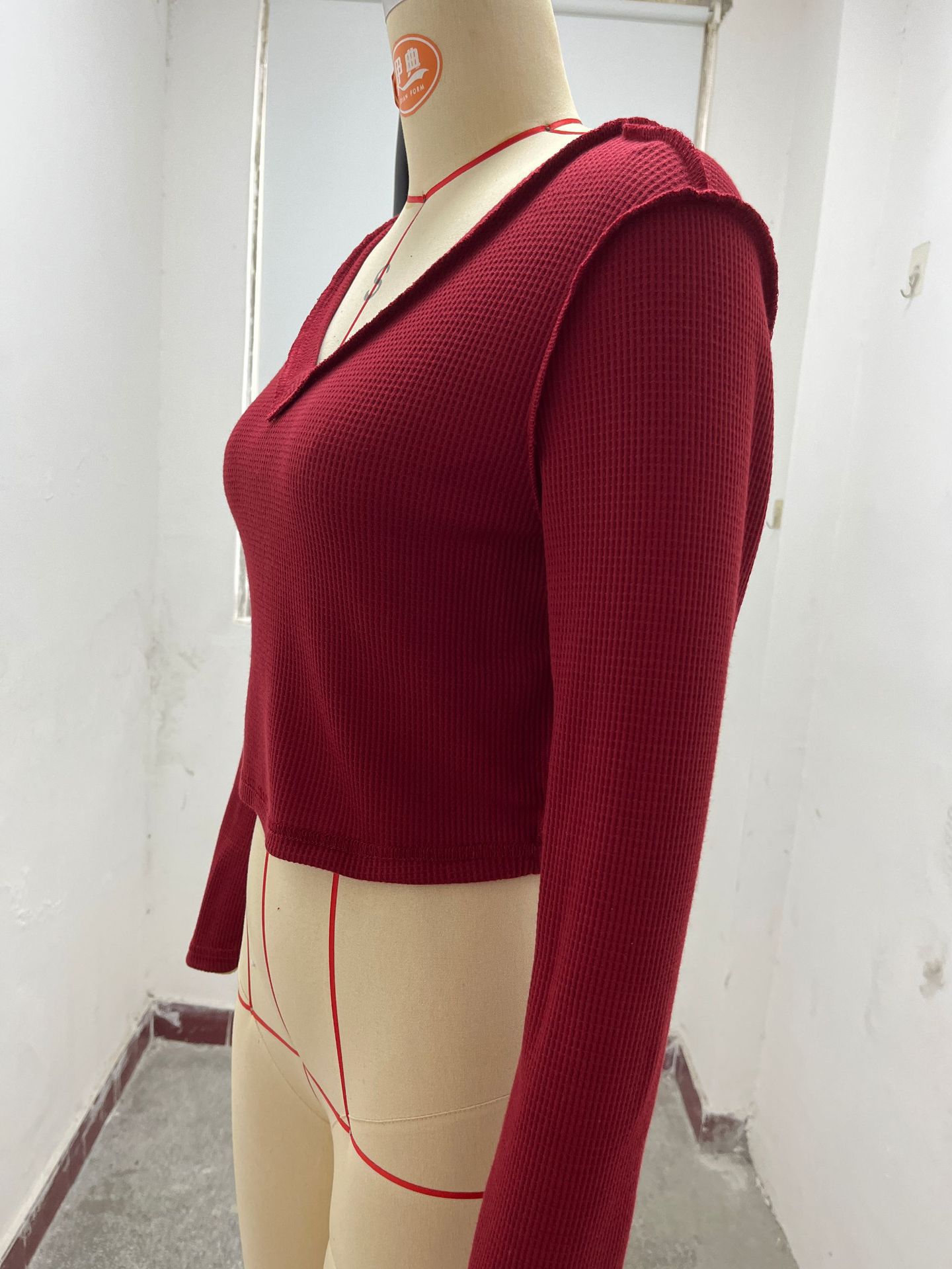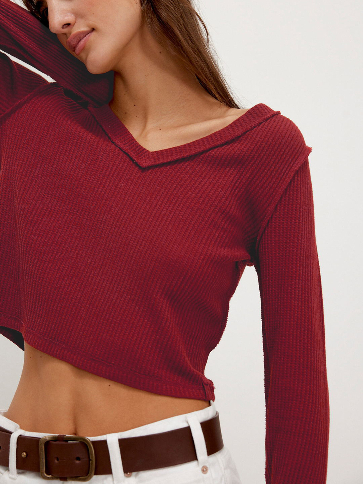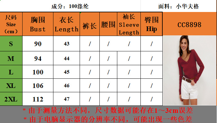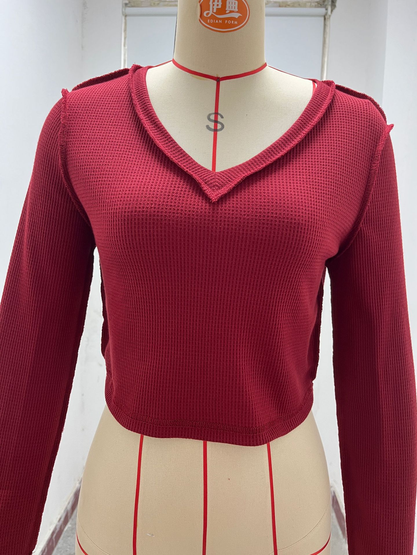 Европейский и американский новый женский однотонный облегающий обычный плечевой длинный рукав маленький вафельный V-образный вырез модный универсальный топ