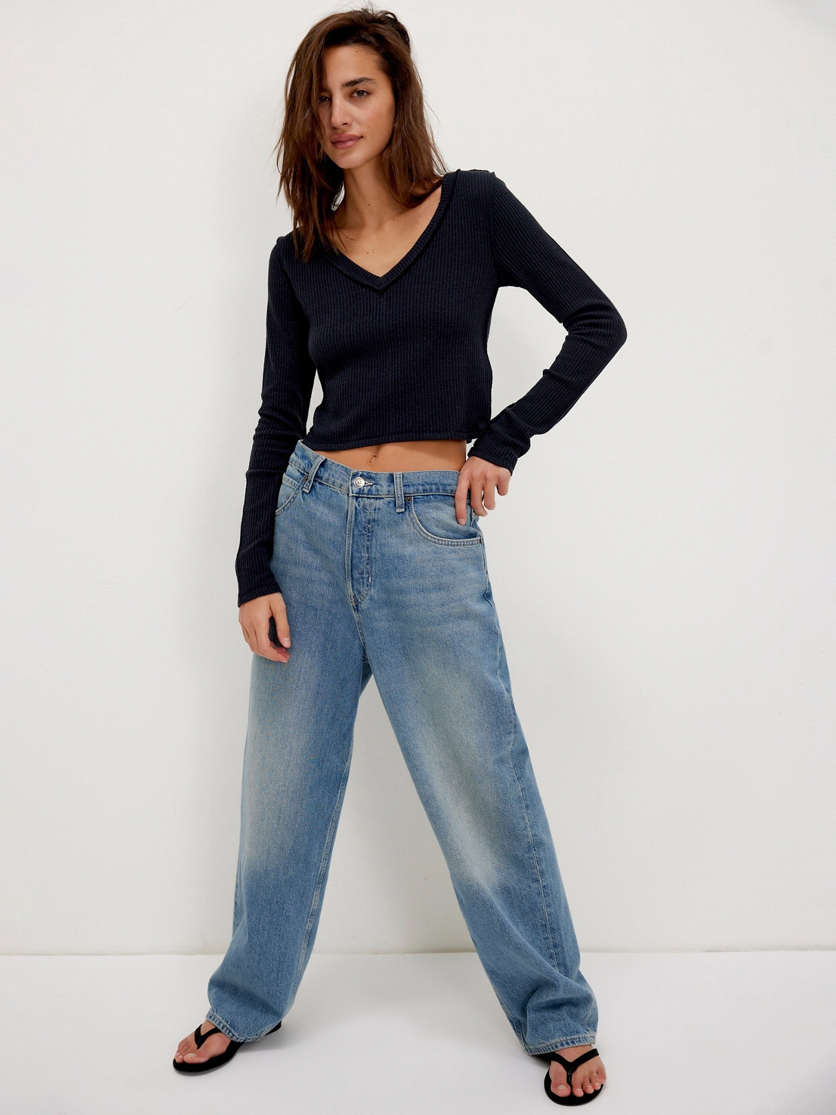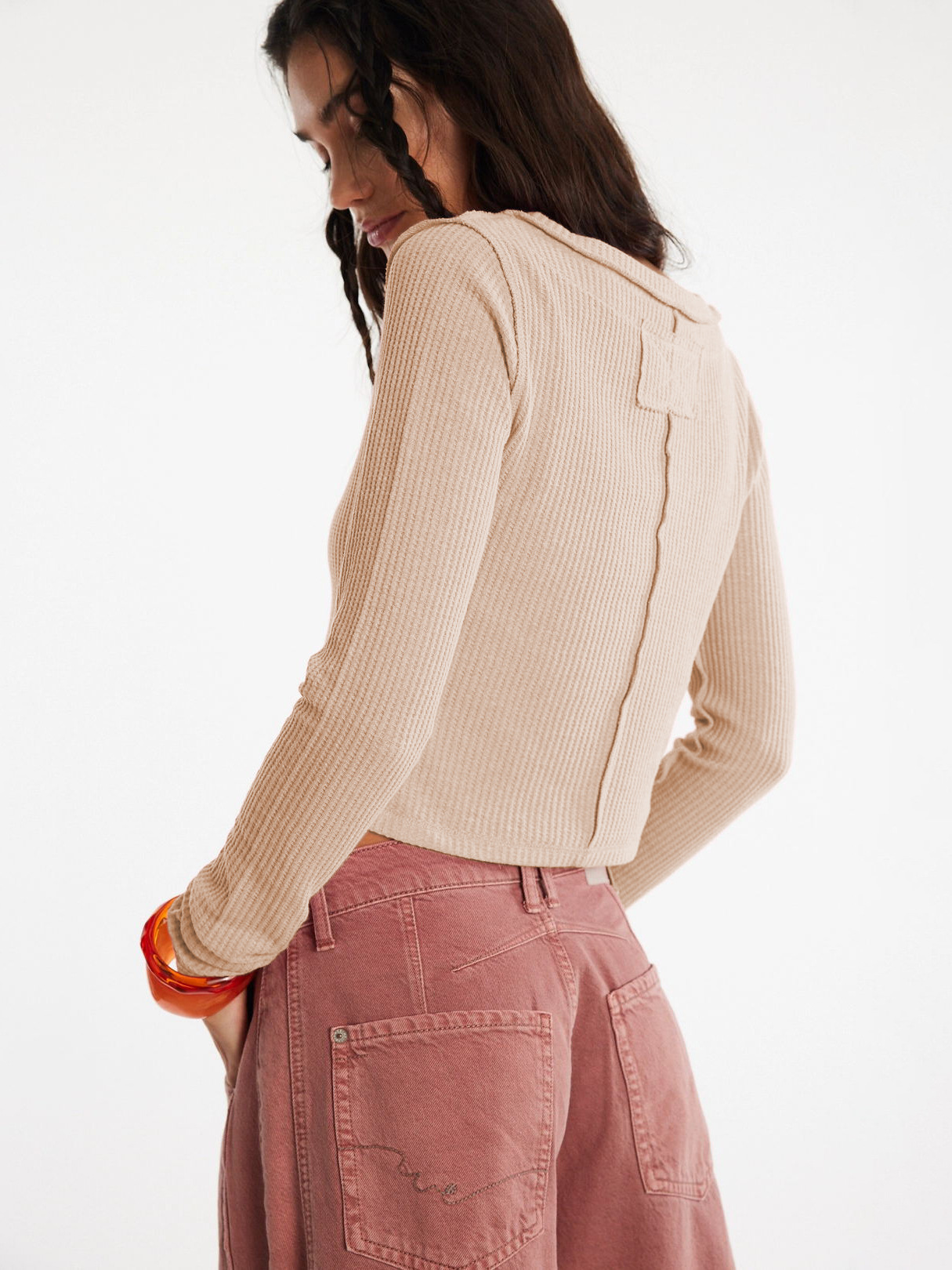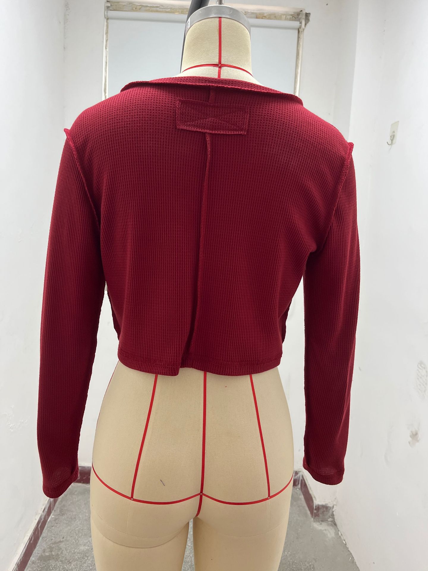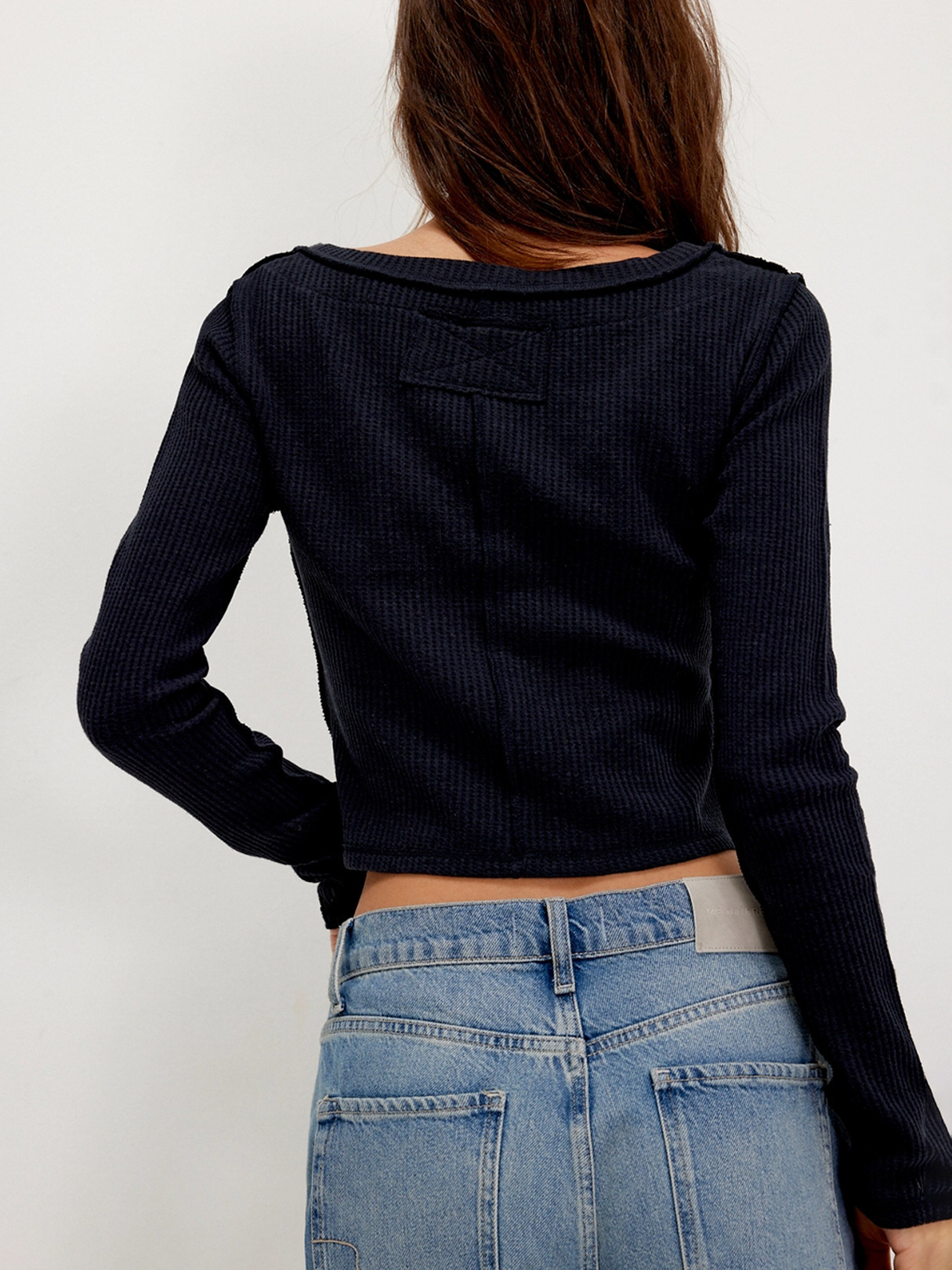 Европейский и американский новый женский однотонный облегающий обычный плечевой длинный рукав маленький вафельный V-образный вырез модный универсальный топ