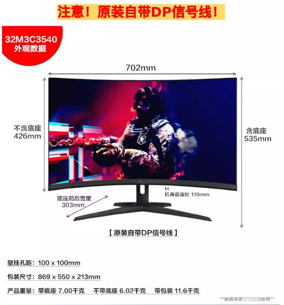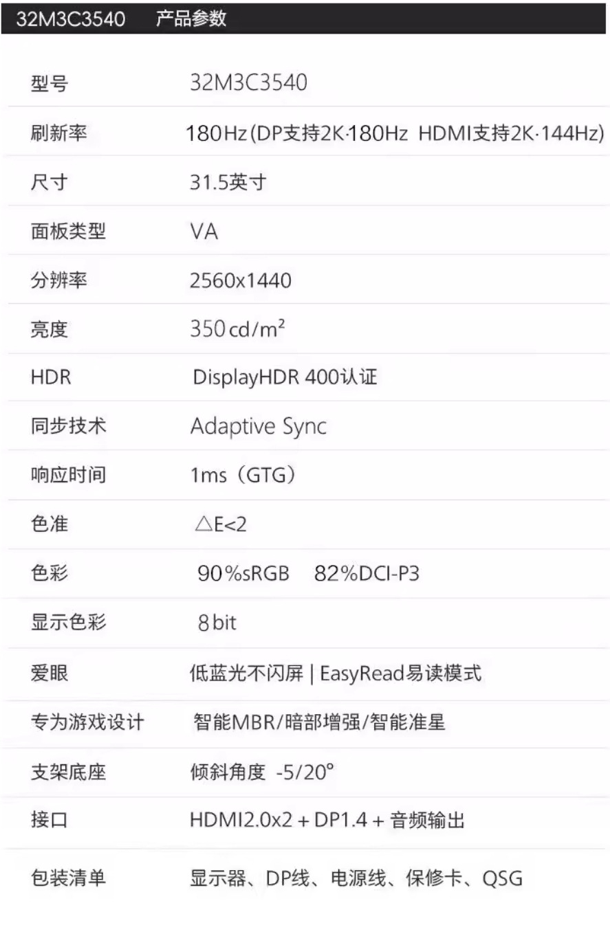Fly/Philips 32M3C3540 32 дюймовый 2K 180Hz изогнутый ЖК дисплей HDMI×2 DP