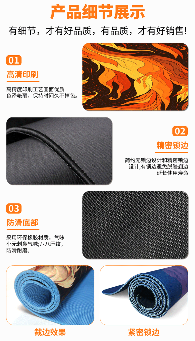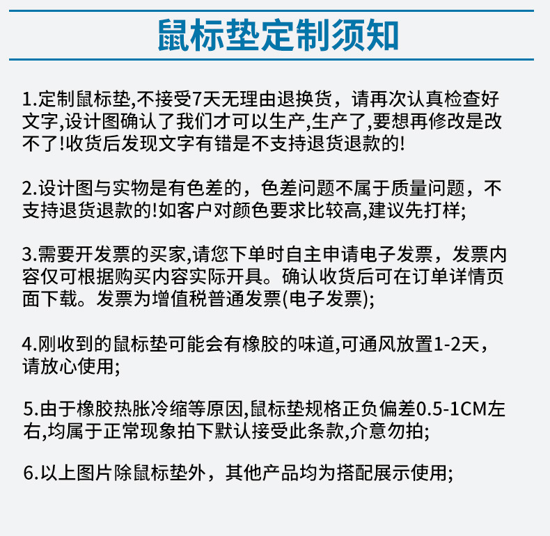 注:本商品为定制商品,鼠标垫可定制的范围在【宽1.2米内,长不限】!标题”超大“并不存在涉嫌误导消费者!样品限拍1个。【样品是为给您查看材质、质量等】此商品为定制产品,页面价格只是为了方便顾客下单,并非实际产品价格。请联系客服咨询。定制产品不联系客服直接拍下均不发货,具体发货时间以和客服沟通为准,具体不同的材质和规格数量的报价请联系我们客服(注:是否锁边、是否带包装等需和客服说明,锁边和包装另行收费,如锁边默认锁黑色,务必知晓)
