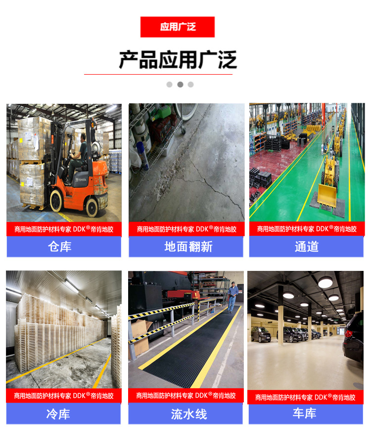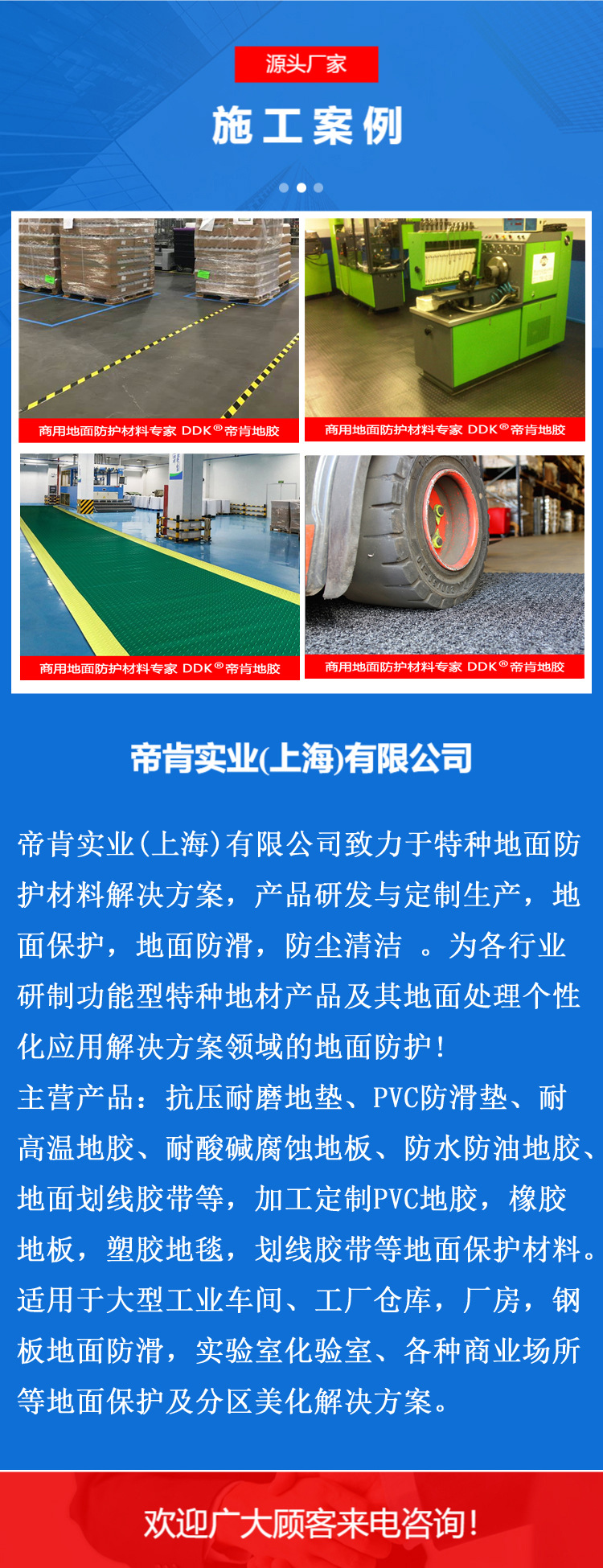 公司主营产品丰富多样,涵盖抗压耐磨地垫、PVC 防滑垫、耐高温地胶、耐酸碱腐蚀地板、防水防油地胶以及地面划线胶带等,同时提供加工定制服务,包括 PVC 地胶、橡胶地板、塑胶地毯和划线胶带等各类地面保护材料。这些产品广泛适用于大型工业车间、工厂仓库、厂房的钢板地面防滑处理,以及实验室、化验室和各类商业场所的地面保护与分区美化,全方位��足不同场景下的地面防护需求,为客户提供专业、高效、定制化的地面防护解决方案,助力客户打造安全、美观、耐用的地面环境。