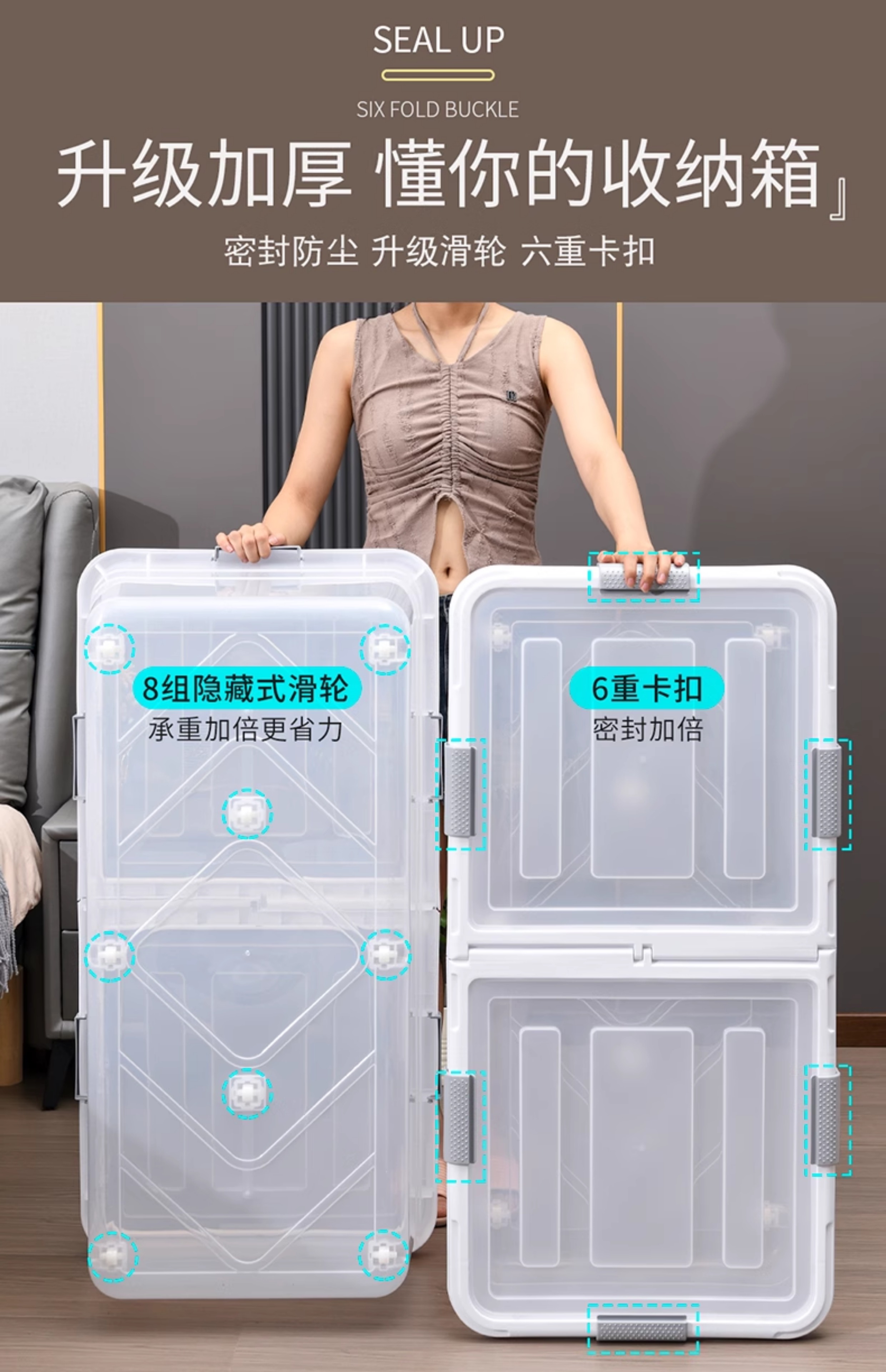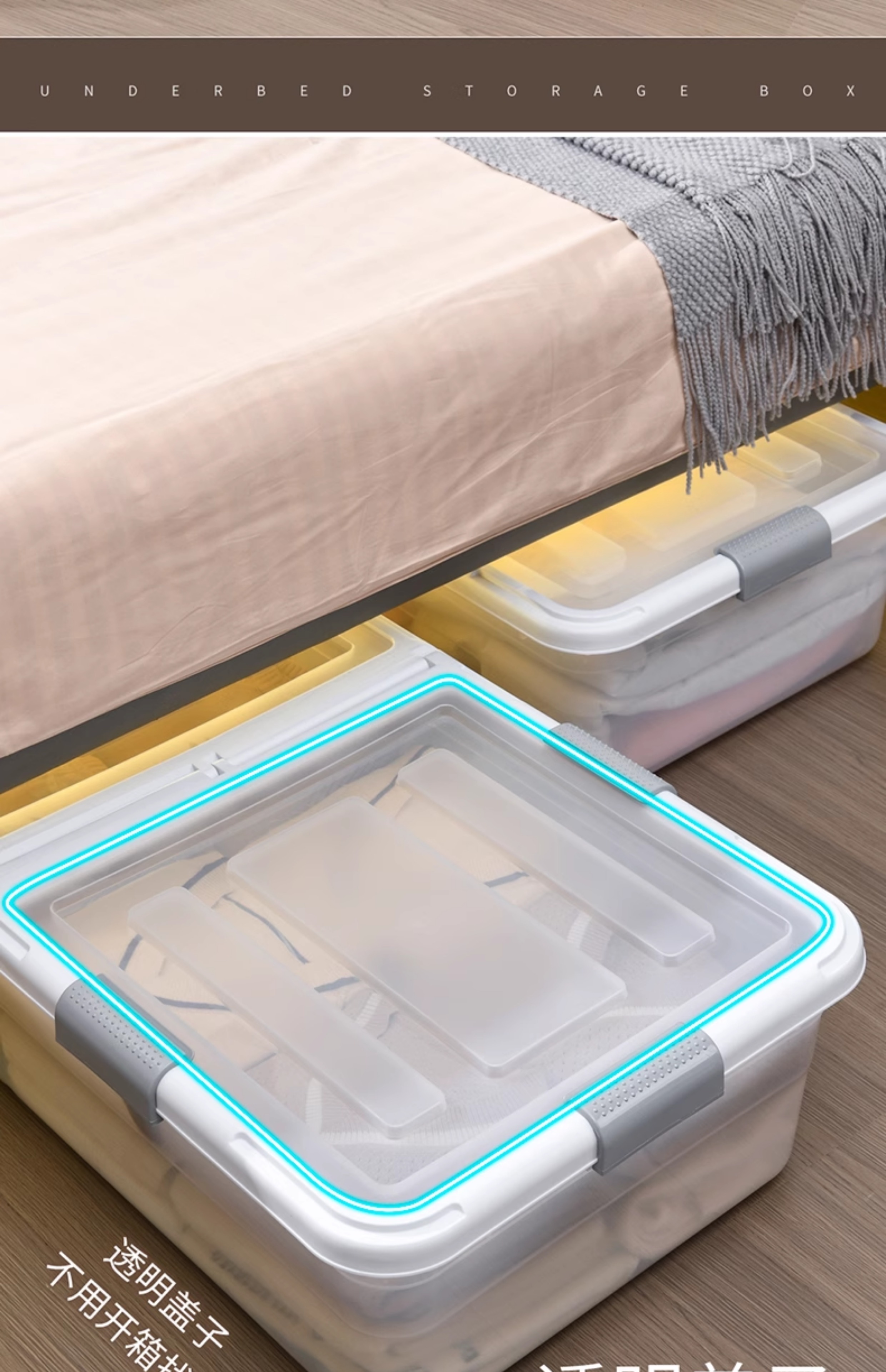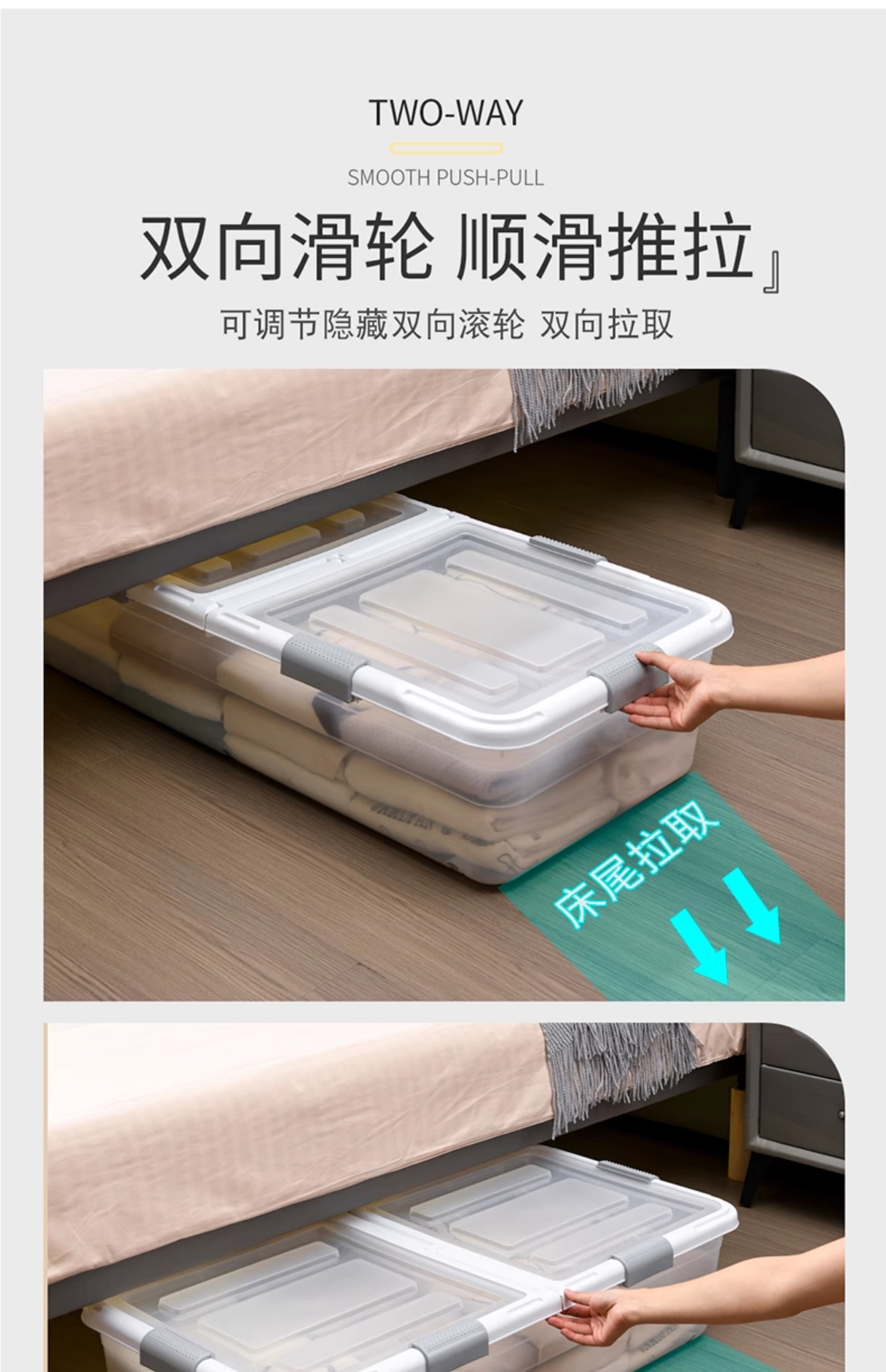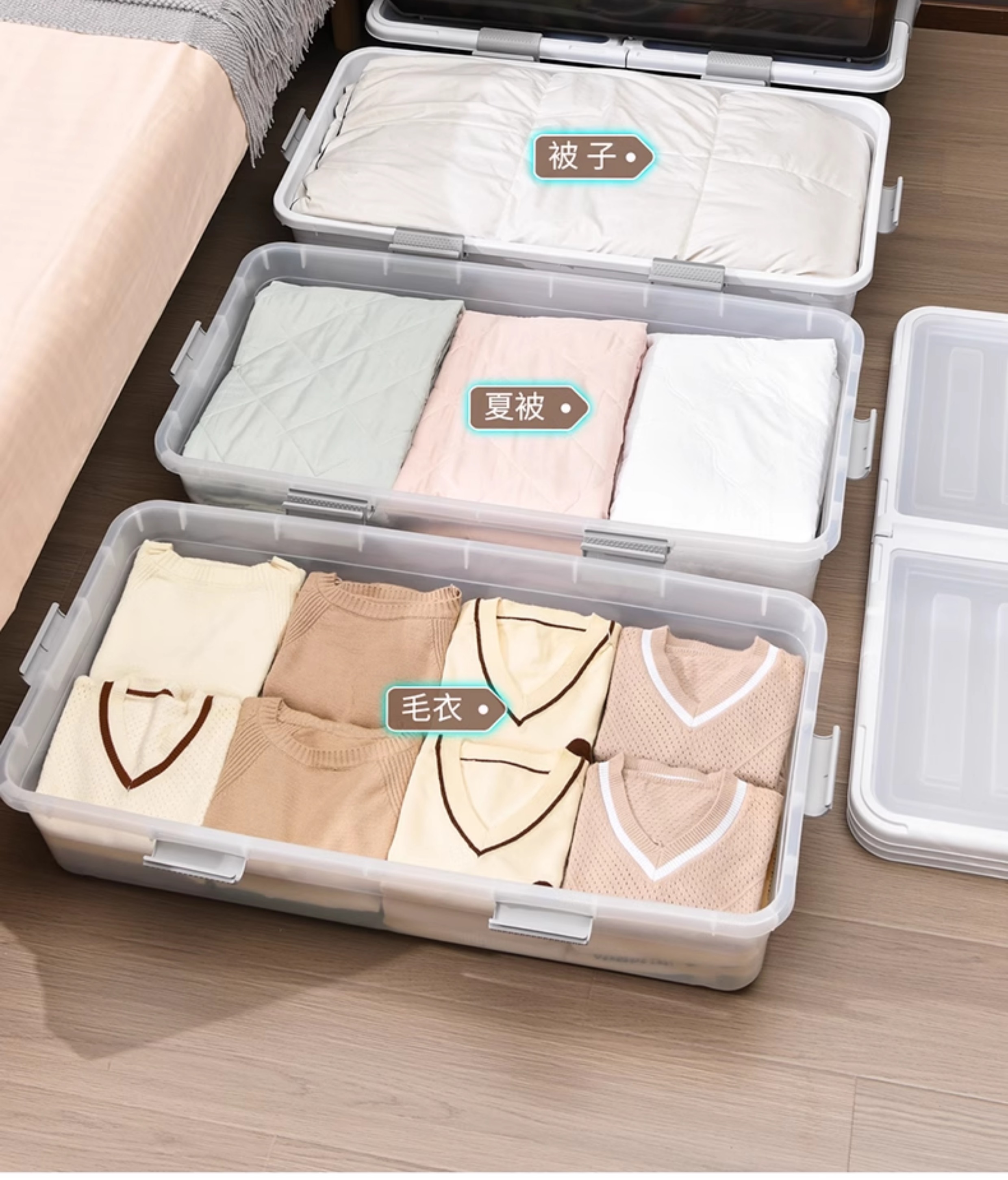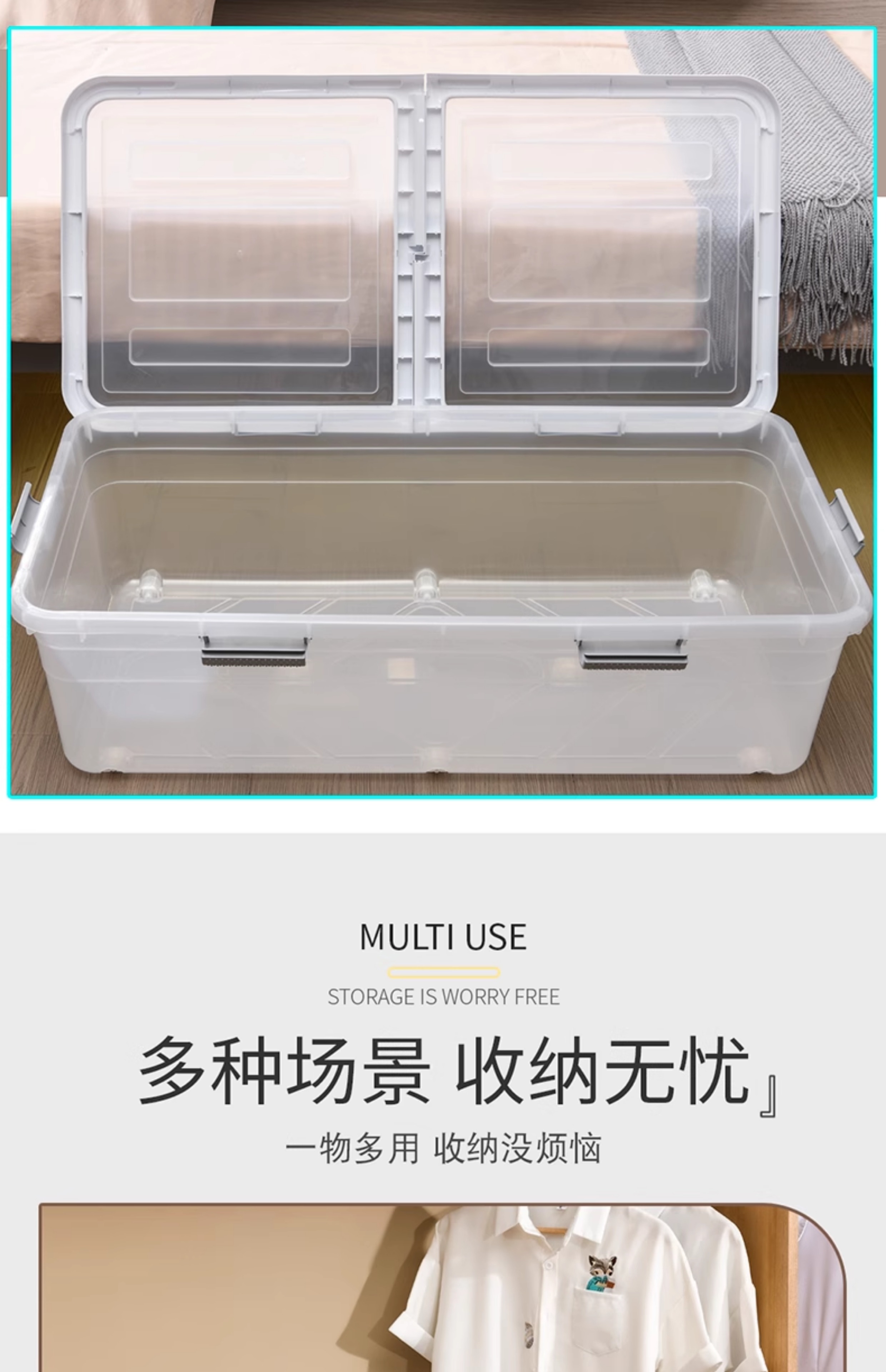 Коробка для хранения под кроватью, плоская с роликами, большая прозрачная коробка для хранения одежды, для общежития, для повседневного использования дома