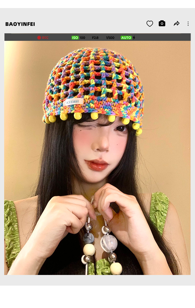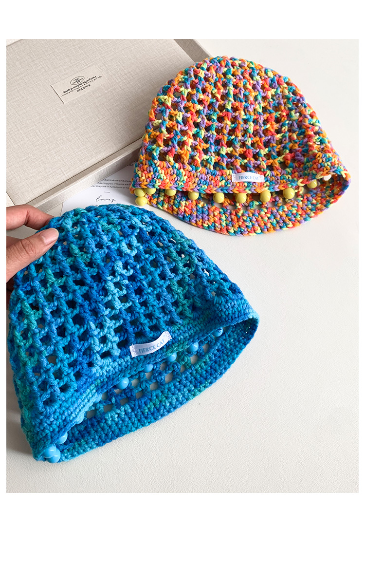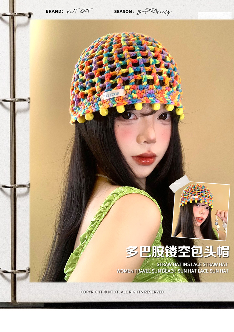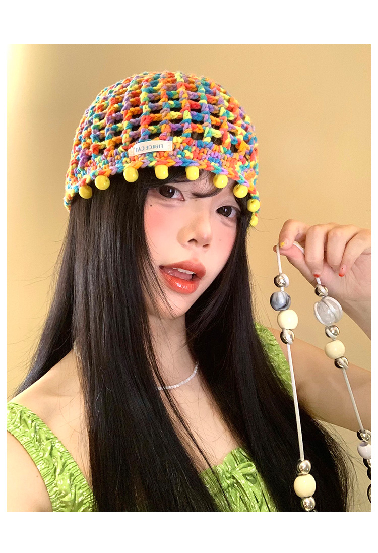 Цветная вязаная шляпа с бусинами для женщин лето 2025 новая тонкая дышащая шляпа с открытым лицом