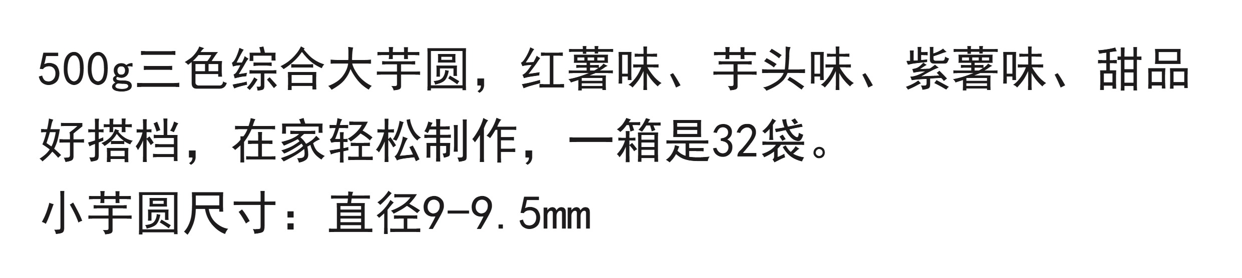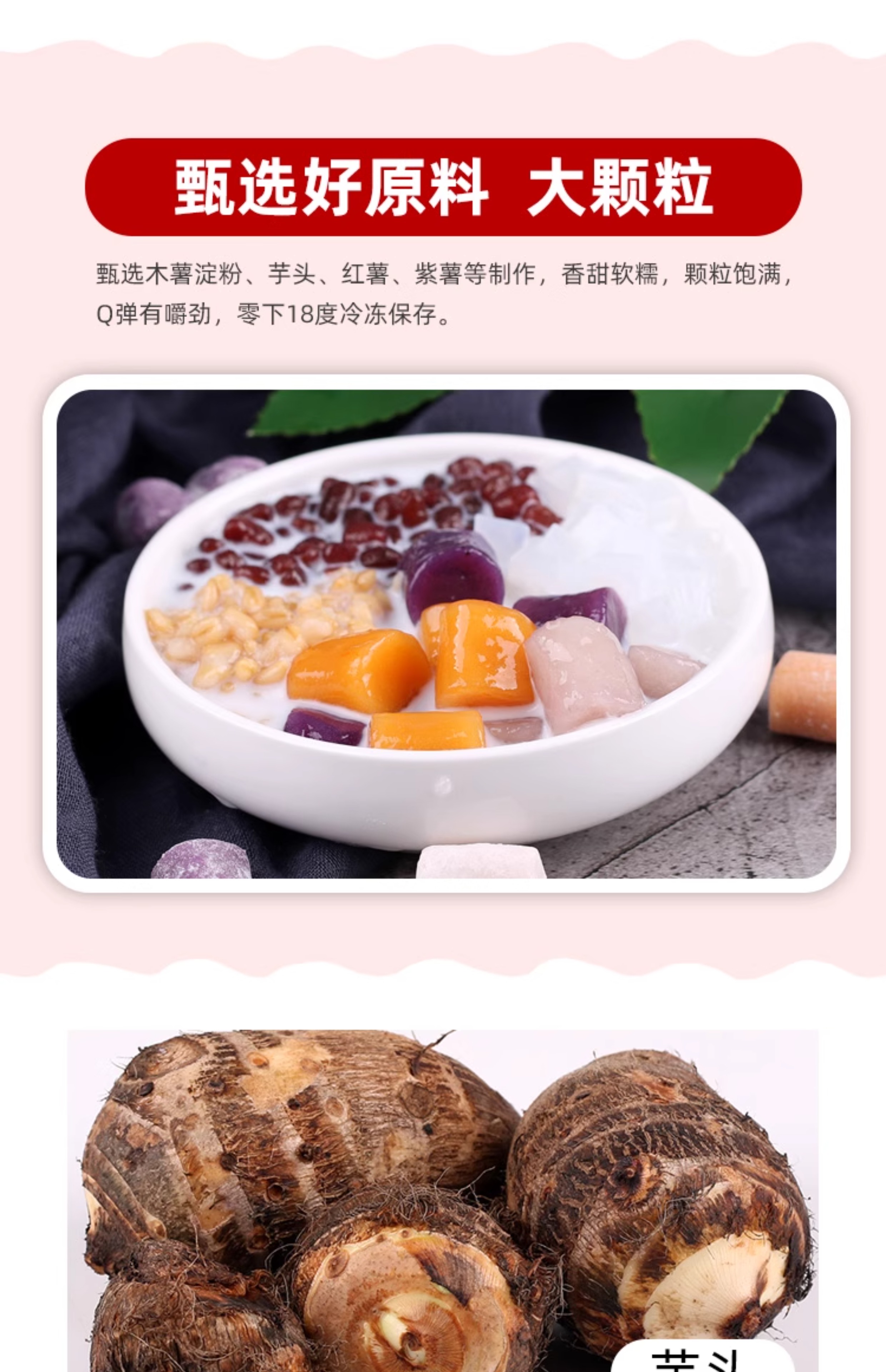 ![]() | [large] 500g taro balls + [small] 500g taro balls | ¥35.58 / ≈ 433 ₽ | 1000 | 6007179567827 | |